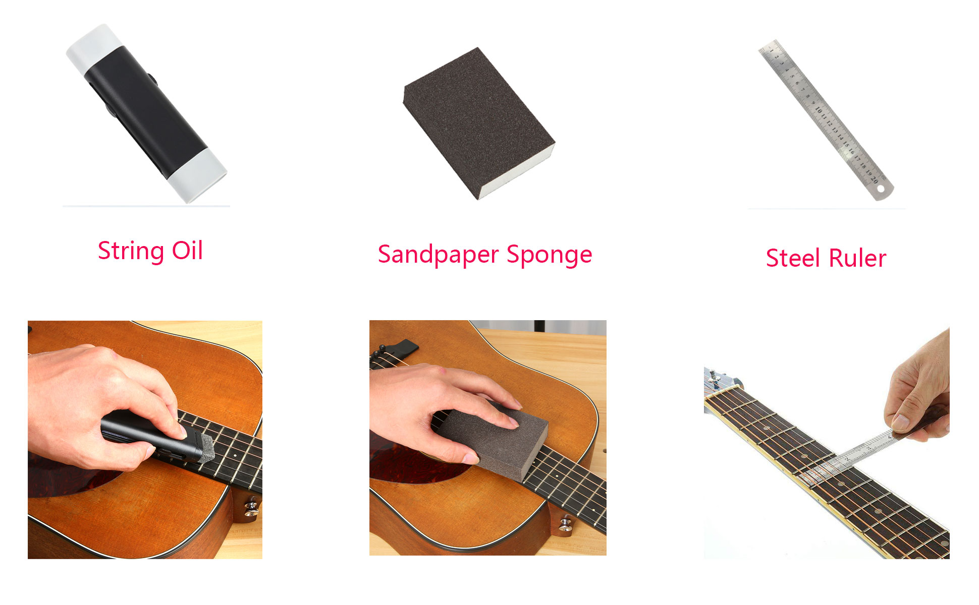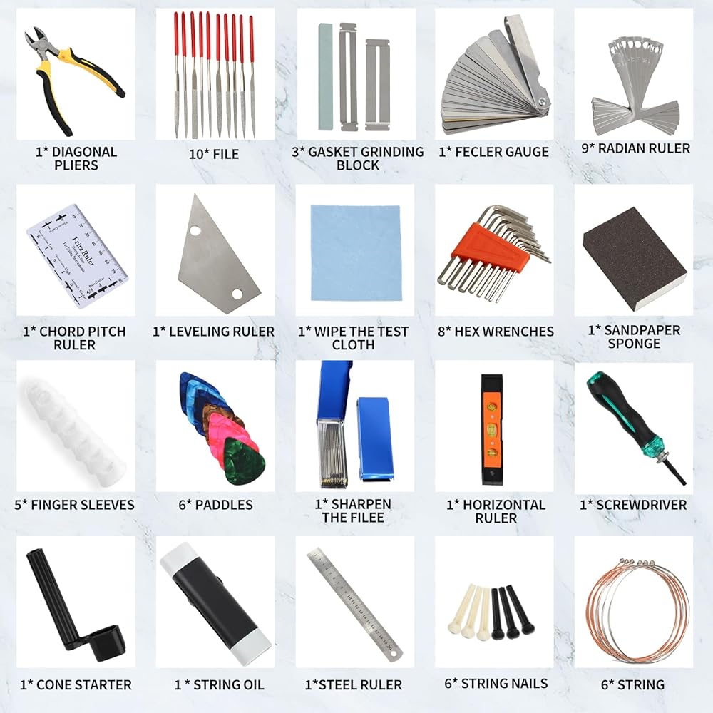 مجموعة أدوات الجيتار المكونة من 79 قطعة: تتضمن أدوات قطع الخيط، ومسطرة عمل الخيط، وتسوية هزاز الجيتار، ولفاف سلسلة جولتار، وموزع الخيط، ومسطرة فولاذية، ومسطرة أفقية، ومفك براغي، وملفات تتويج الحنق، ومقاييس نصف قطر الخيط السفلي، ومفاتيح ألين، وواقي حامي للوحة الفريتس، حجر الطحن، مقياس المحسس، مبرد الإبرة، دبابيس الجسر، أوتار الجيتار، قماش المسح، إسفنجة الطحن، اختيار الجيتار، دبوس الطباعة، حقيبة التخزين.