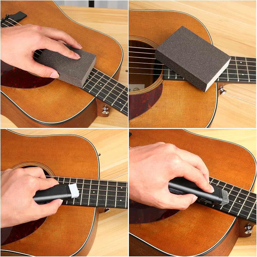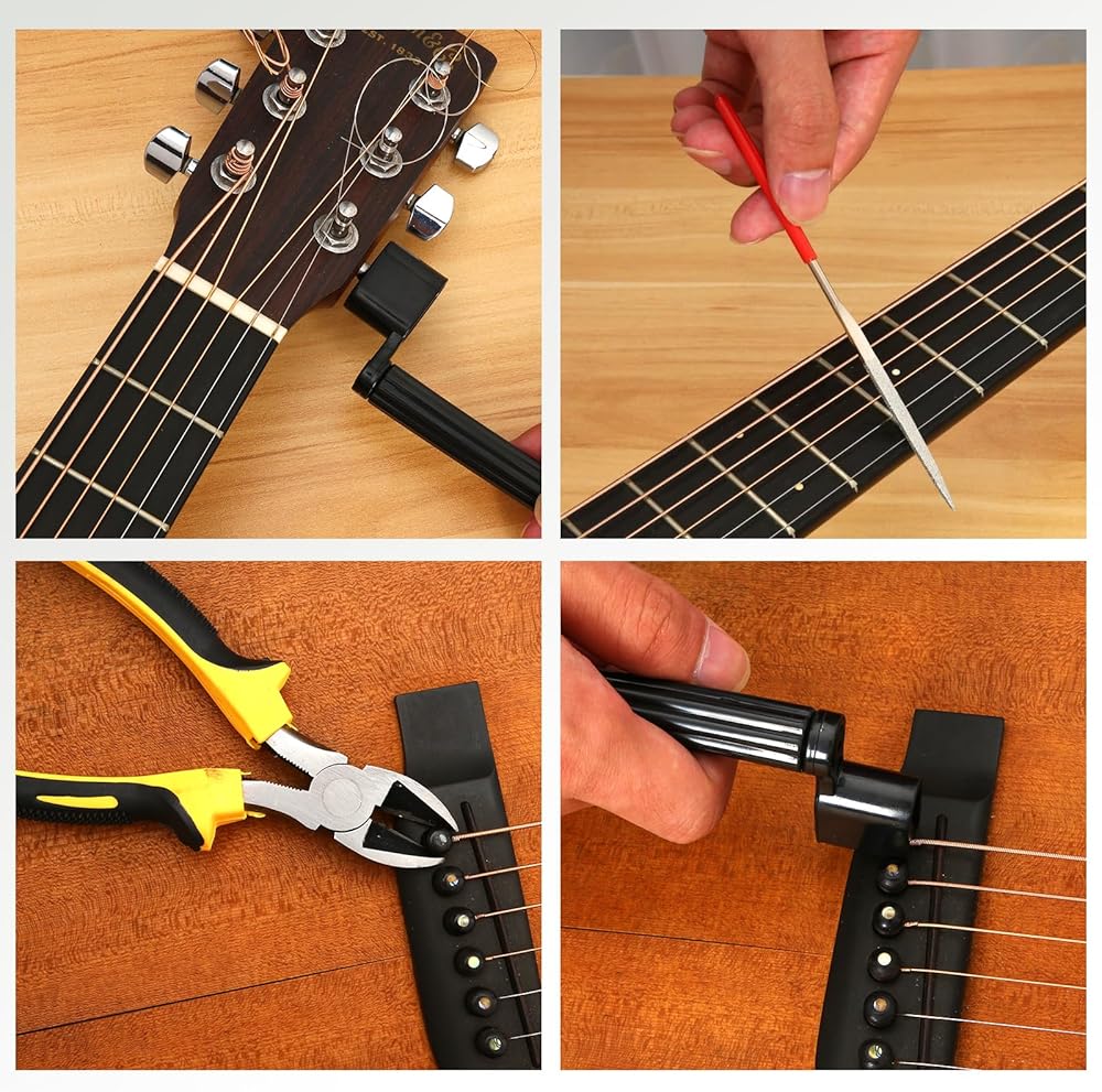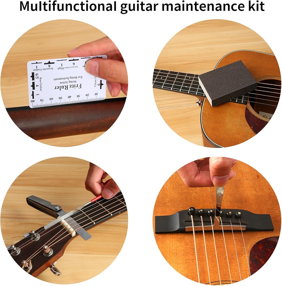 مريحة للحمل: جميع الأدوات الضرورية معبأة في حقيبة واحدة، مريحة جدًا للحمل والسفر. مجموعة أدوات الصيانة والإصلاح المدمجة، هدية مثالية للموسيقيين أو المبتدئين أو الهواة.