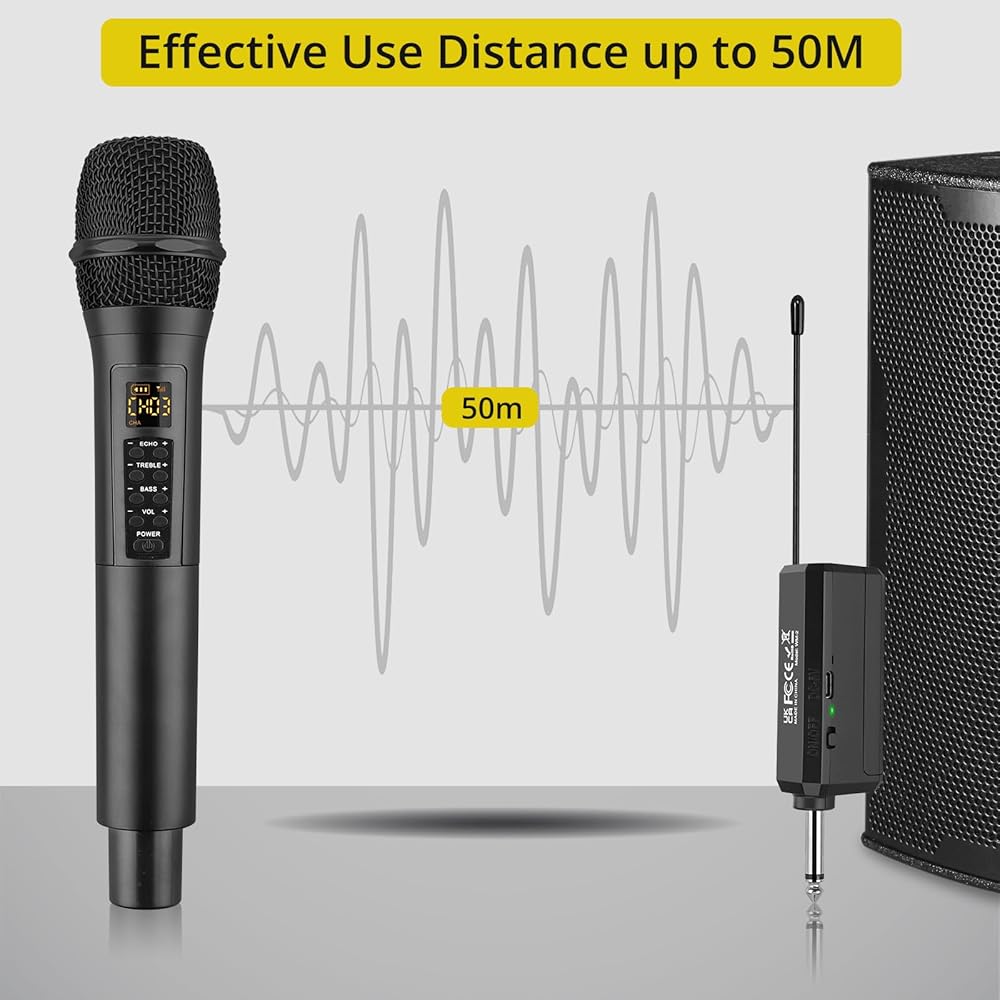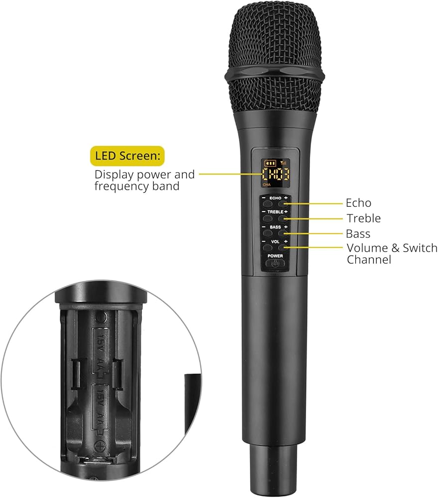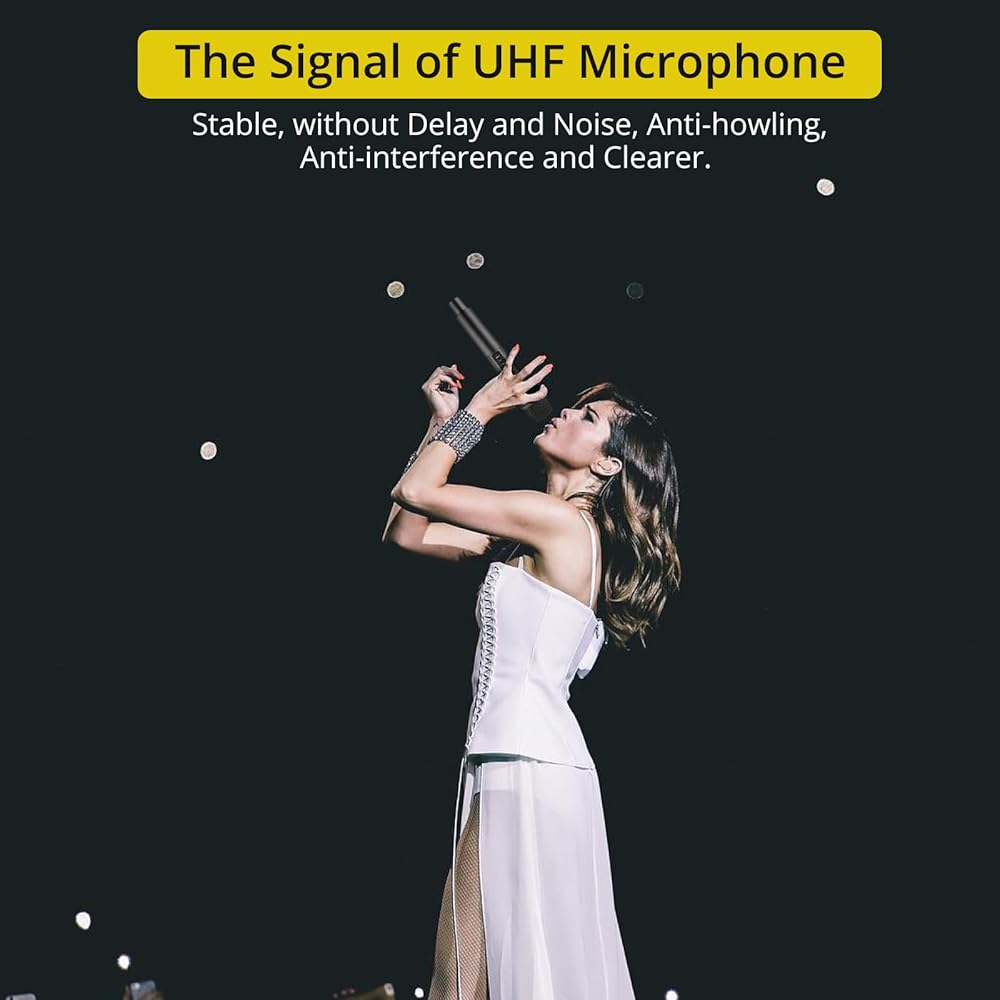 【ميكروفون قابل للتعديل بتردد UHF】ميكروفون معدني لاسلكي قابل للتعديل بتقنية UHF، مع شاشة LED، مع ضبط صوت جهوري عالي، تعديل الصدى، ضبط مستوى الصوت وغيرها من الوظائف، بحيث يمكنك ضبط الصوت في أي وقت بإصبع فقط.