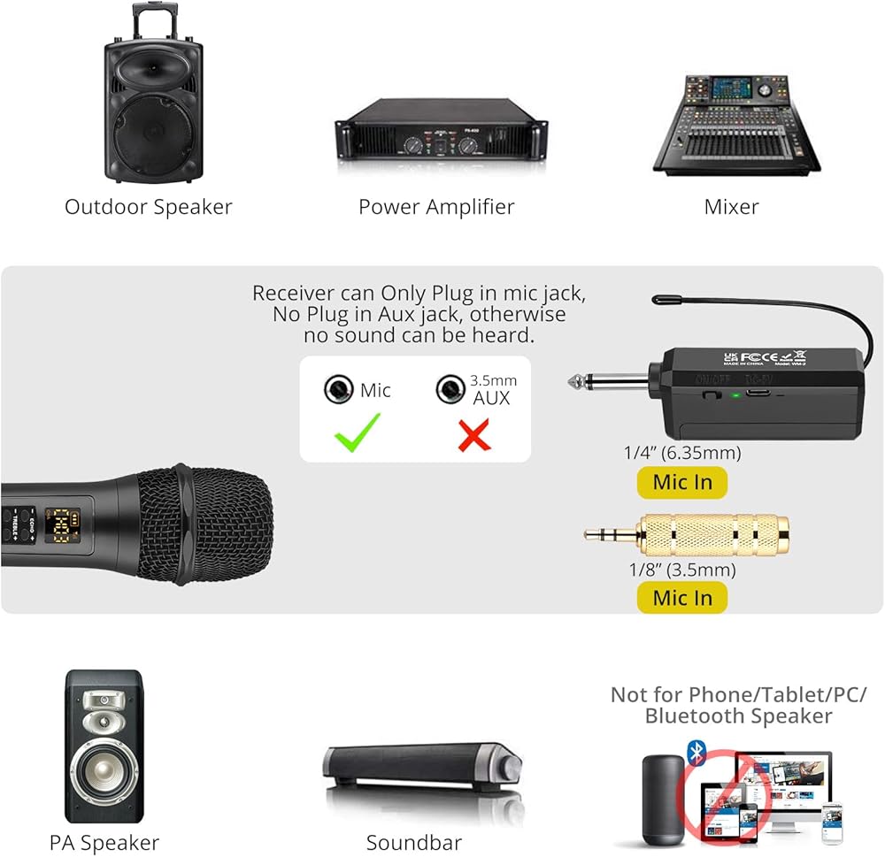 【التوصيل والتشغيل】يقوم جهاز الاستقبال بمسح الميكروفون تلقائيًا، ما عليك سوى إدخال جهاز الاستقبال في واجهة الميكروفون، وتشغيل مفتاح الميكروفون، والانتظار لفترة من الوقت، ثم يمكنك الغناء بسعادة (ملاحظة: واجهة ايه يو اكس غير مدعومة، قد تحتاج إلى الانتظار لفترة أطول قليلاً للاستخدام الأول)