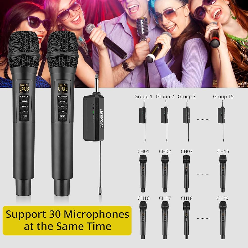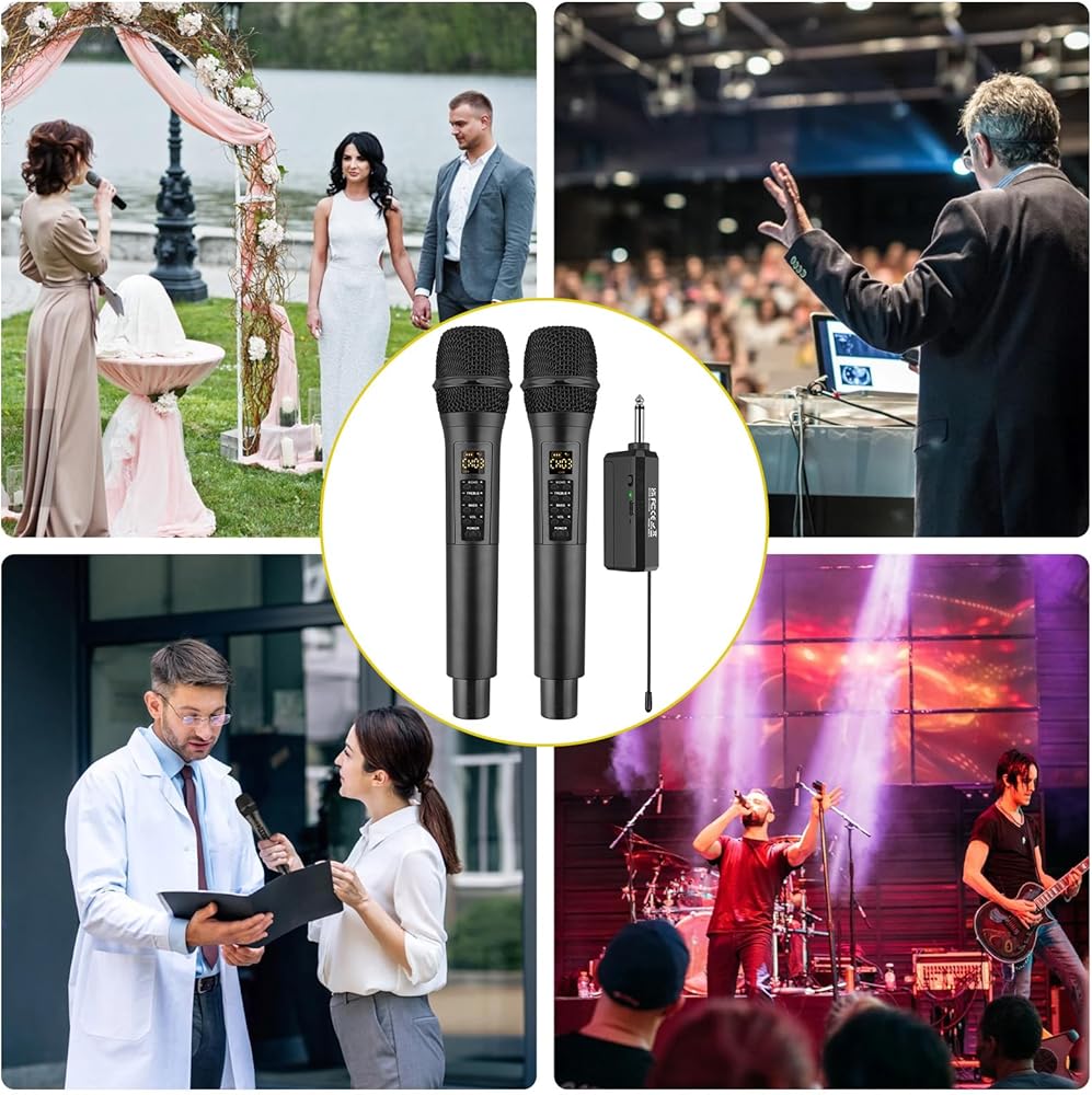 بروزور ميكروفون لاسلكي مع تحكم في مستوى الصوت الجهوري الثلاثي، نظام ميكروفون ديناميكي مزدوج UHF محمول باليد مع جهاز استقبال قابل لاعادة الشحن لالات الكاريوكي والدي جيه والغناء والكنيسة وحفلات الزفاف
