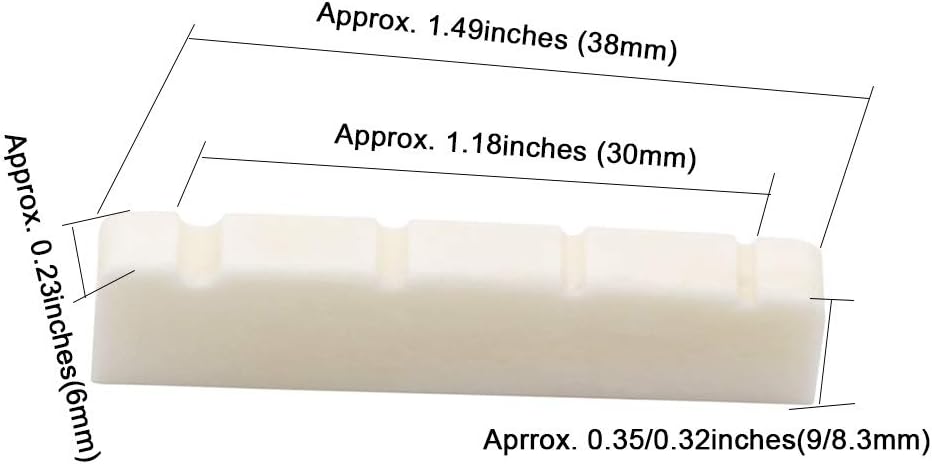 ملحوظة: يرجى قياس أبعاد صامولة الجيتار الخاصة بك بعناية قبل طلبك. قد تحتاج إلى صنفرة الفتحات أو تعميقها وتلميع الصامولة عند تركيبها. يمكن بسهولة إزالة صواميل الجيتار العظمية الخاصة بنا باستخدام ورق الصنفرة الناعم لتحقيق ملاءمة مثالية لجيتارك