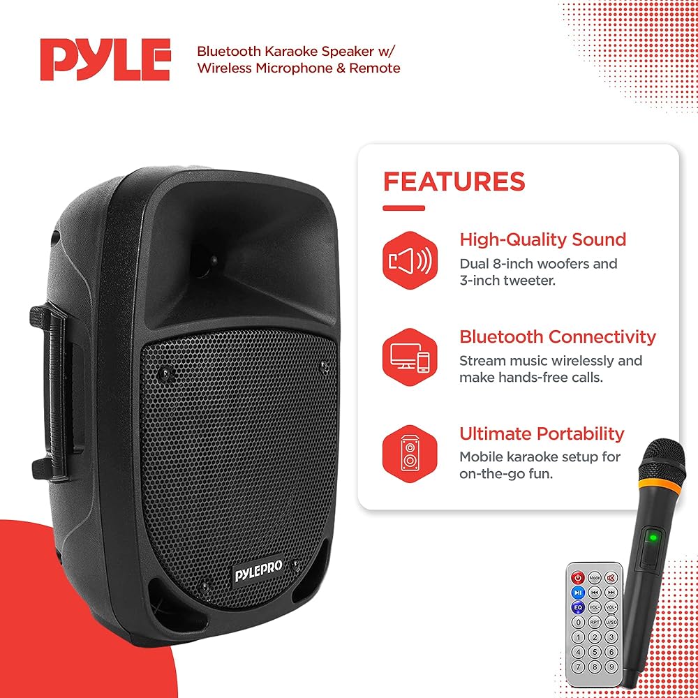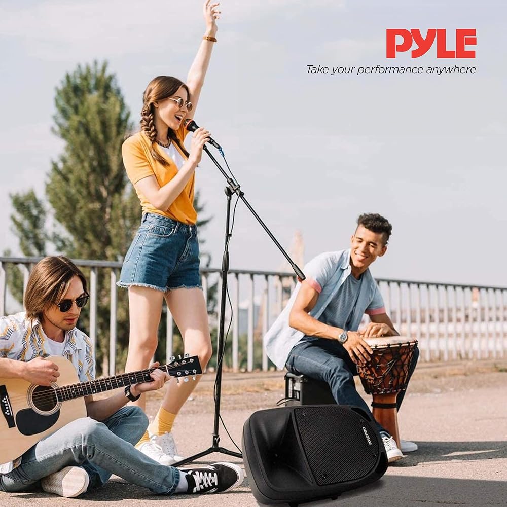 بطارية قابلة لإعادة الشحن: مكبر الصوت Pyle PA المزود بميكروفون رائع للكاريوكي والعروض المسرحية والتحكم في الحشود. إنها قابلة للحمل بالكامل مع بطارية مدمجة قابلة لإعادة الشحن، وعجلات دوارة، ومقبض ممتد حتى تتمكن من أخذها إلى أي مكان تذهب إليه.