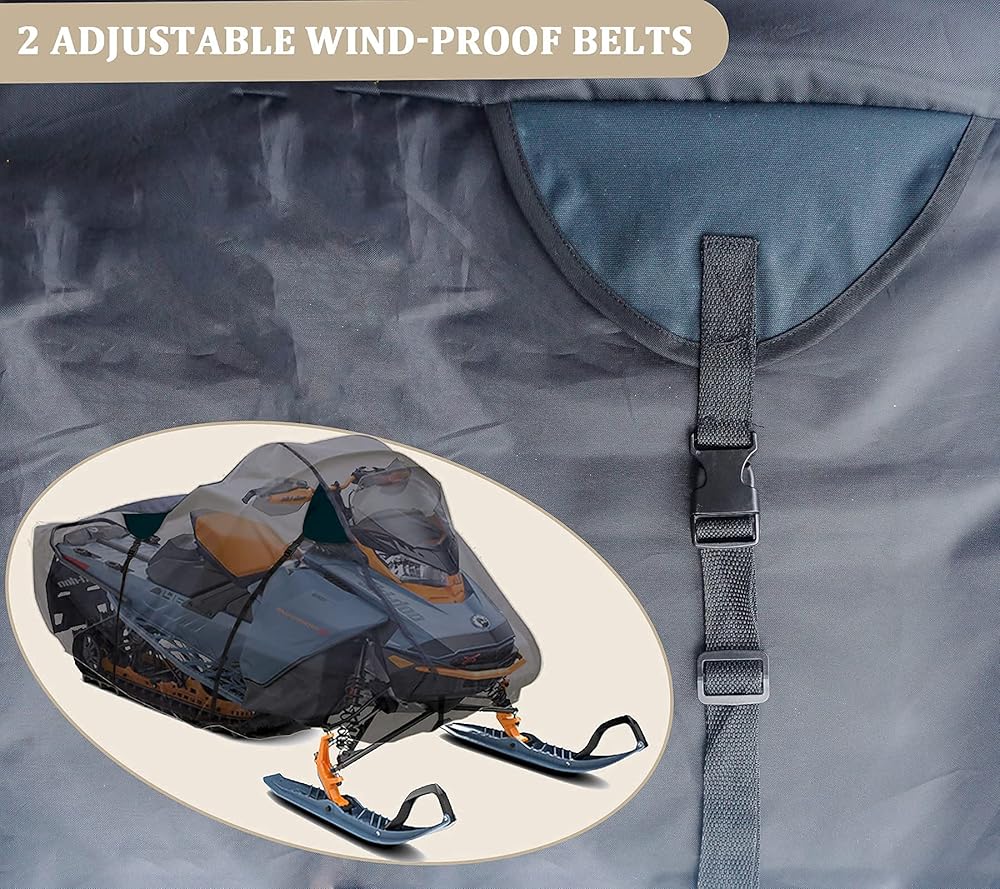 [نسيج مقاوم للرياح قابل للتعديل] يحتوي غطاء آلة الثلج على شريطين مقاومين للرياح قابلين للتعديل، يمران عبر الجزء السفلي من عربة الثلج لتأمين الغطاء لمنعه من الريح.