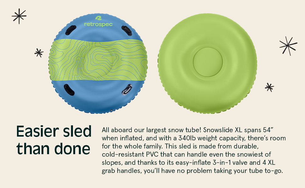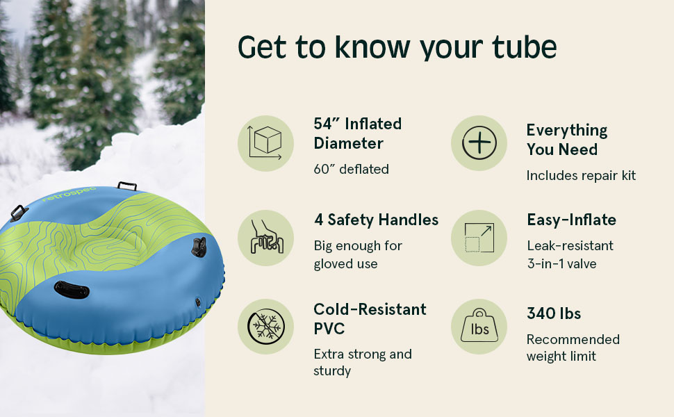 كل ذلك على متن أكبر أنبوب ثلج لدينا! تمتد زحليقة الثلج XL 54 انش عند النفخ، وبسعة وزن 350 باوند، هناك مساحة لجميع أفراد العائلة. هذه الزلاجة مصنوعة من بلاستيك PVC المتين والمقاوم للبرد والذي يمكنه تحمل حتى أكثر المنحدرات، وبفضل صمام 3 في 1 سهل النفخ ومقابض الإمساك 4 XL، لن تواجه مشكلة في اصطحاب الأنبوب الخاص بك. أنبوب الثلج هذا مصنوع من بلاستيك PVC المتين 0.6 ملم القوي والمتين والقادر على تحمل درجات حرارة منخفضة تصل إلى -25 درجة مئوية (-13 درجة فهرنهايت). يأتي هذا الأنبوب مع كل ما تحتاجه ليوم واحد على المنحدرات، بما في ذلك مجموعة إصلاح (فقط في حالة). يبلغ قطر هذا الأنبوب 54 انش، وهو واسع للغاية ومريح للانزلاق على المنحدرات. زحليقة الثلج XL منخفضة الاحتكاك على الثلج، مما يسمح لك بتسريع الأشياء أثناء الانزلاق لأسفل.