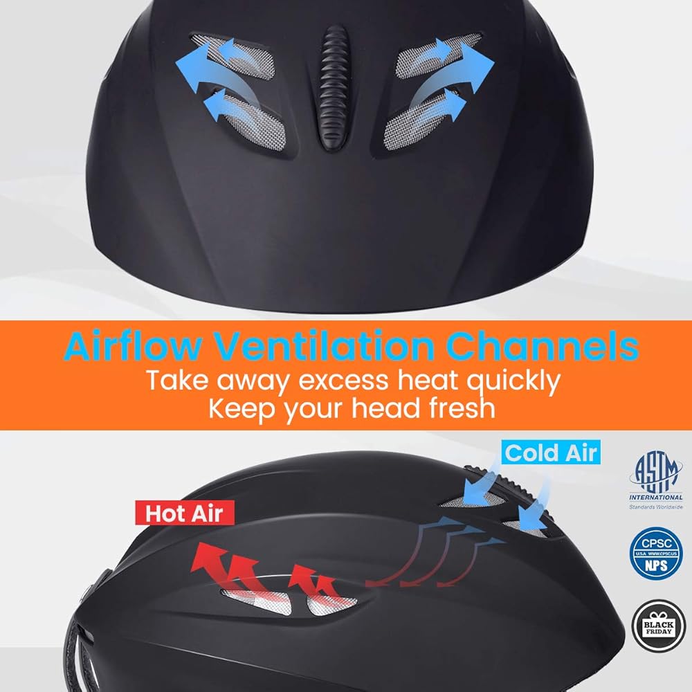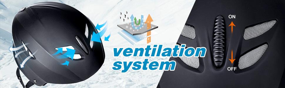 فتحات تهوية قابلة للغلق 10 فتحات تهوية تمامًا على كلا الجانبين في الأمام، أعلى وخلفية الخوذة لضمان التهوية داخلها، مما يساعد بشكل فعال على النظارات من الضباب. اضغط على الزر الموجود على الخوذة لفتح/إغلاق الفتحتين الأماميتين..انتبه: متوفر فقط مقاس L، مناسب للبالغين أو الشباب مع انحراف الرأس من 58 إلى 61 سم، حقيبة تخزين بيضاء مرفقة.