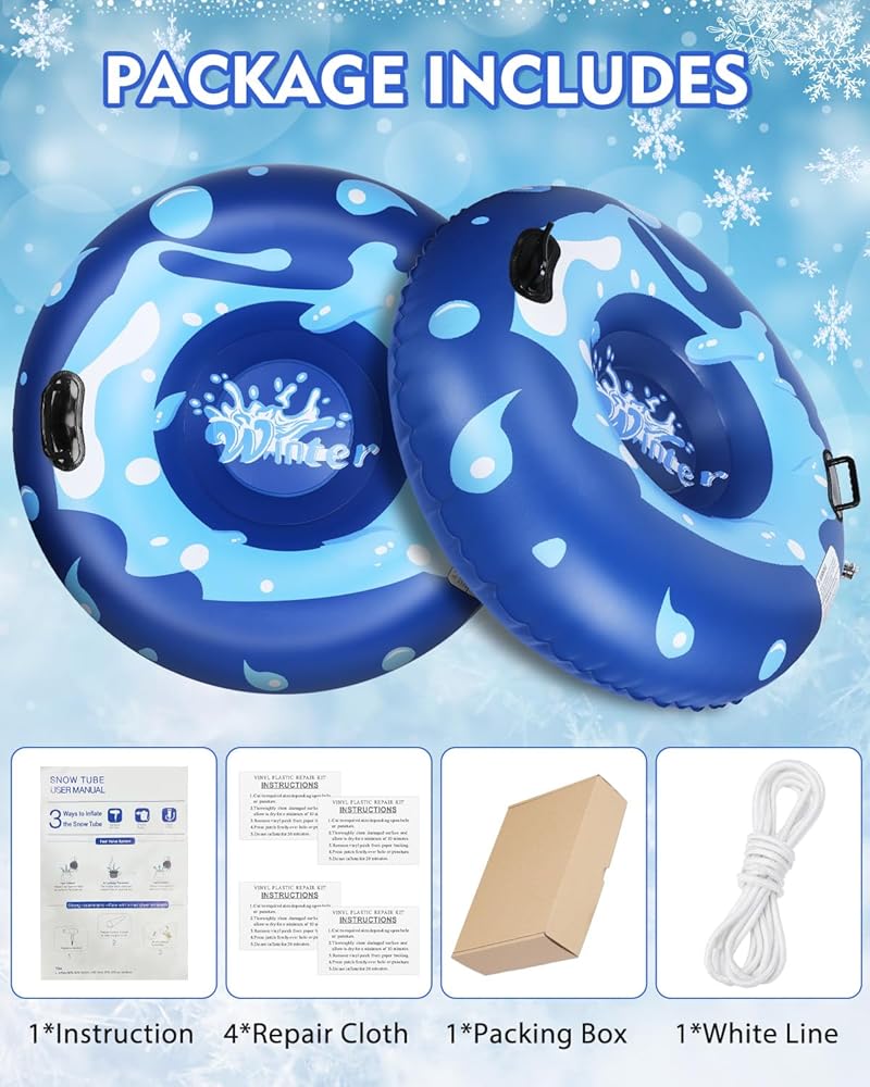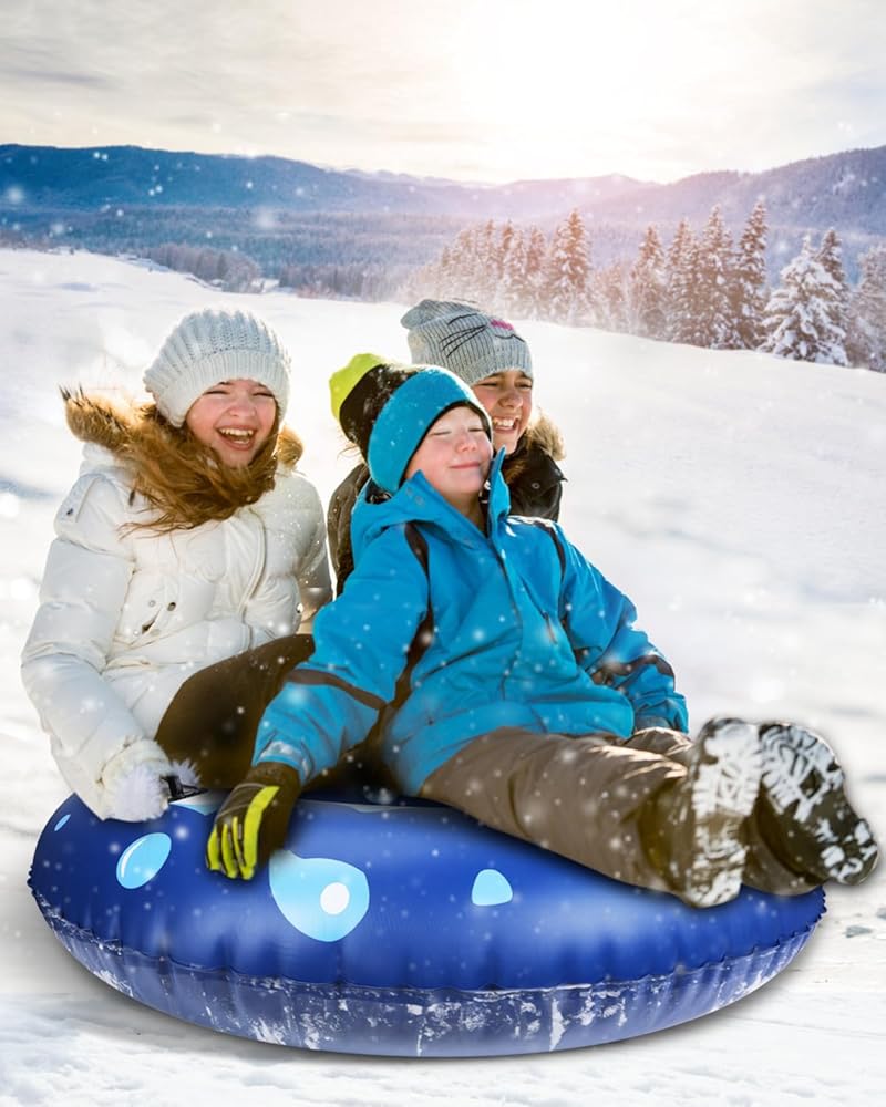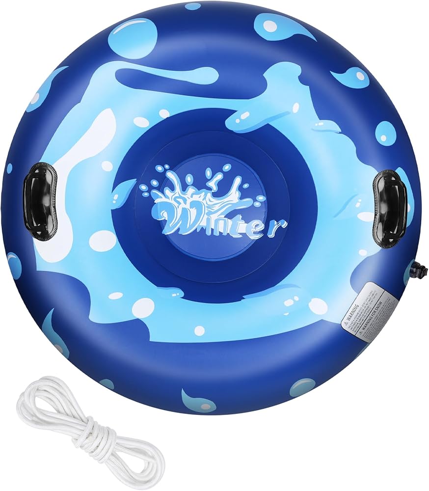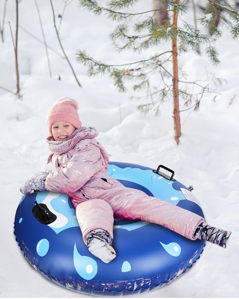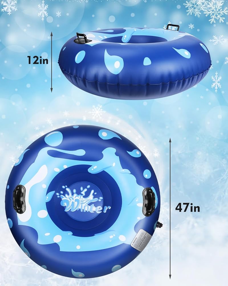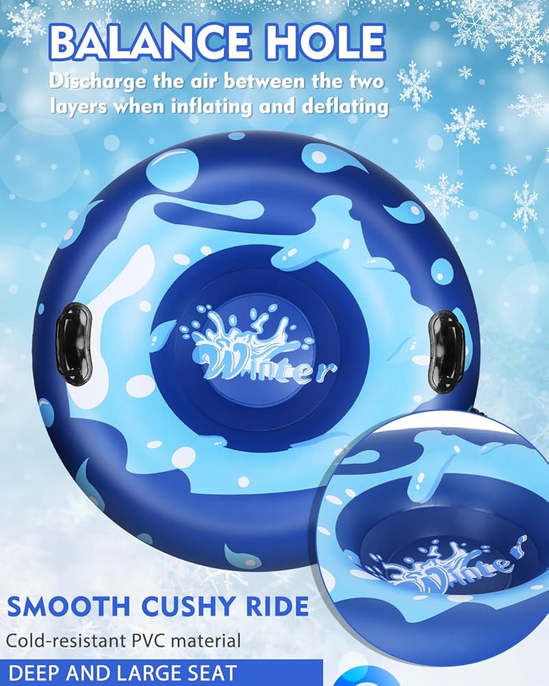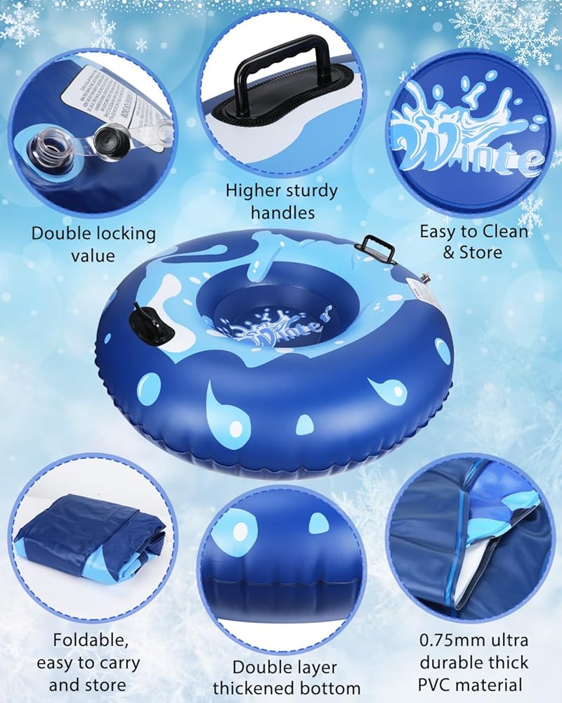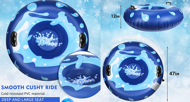 Heavy Duty Snow Tube: Made of 0.8mm thickened PVC material on bottom. This flexible material not only performs better on the snow, but it also won't freeze or crack in cold temperatures like typical inflatable snow tubes.