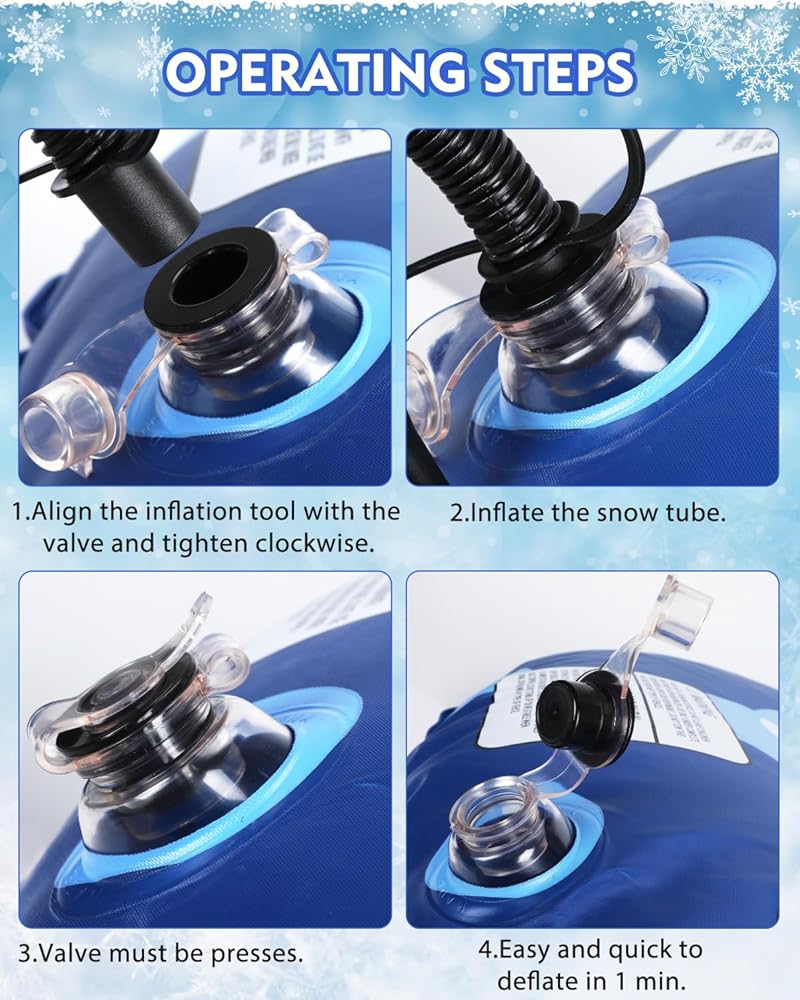 Leak-Proof Double-Lock Valve - The double-lock valve used in the snow tube will ensure air tightness. Inflate snow sled quickly through the large valve for a few seconds, and then replenish air through the small valve.Model Number:LCC109