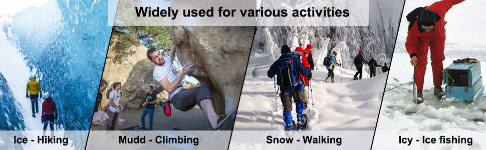 【سهلة الارتداء】مقابض الأحذية للثلج والثلج لأحذية التنزه سيرًا على الأقدام خفيفة الوزن ويمكن وضعها في حقيبة الحمل المتضمنة ولن تشغل مساحة كبيرة. وفي الوقت نفسه، من السهل ارتداؤه، كل ما عليك فعله هو ربط الطرف الأمامي بإصبع القدم، والطرف الخلفي بالكعب وإجراء التعديلات المناسبة، ويمكنك ارتداء الأشرطة في دقيقة واحدة.