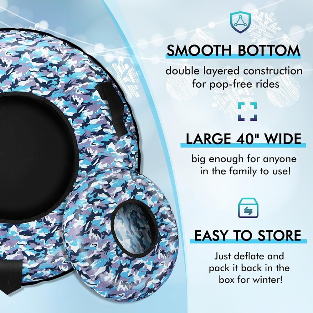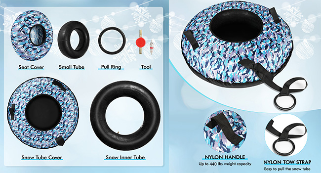 أنبوب الثلج شديد التحمل: مصنوع من مادة PVC بسمك 0.75 مم في الأسفل. هذه المادة المرنة لا تعمل بشكل أفضل على الثلج فحسب، ولكنها أيضًا لن تتجمد أو تتشقق في درجات الحرارة الباردة مثل أنابيب الثلج التقليدية القابلة للنفخ.
