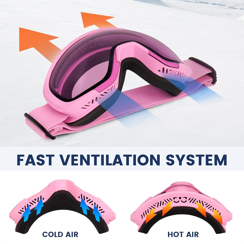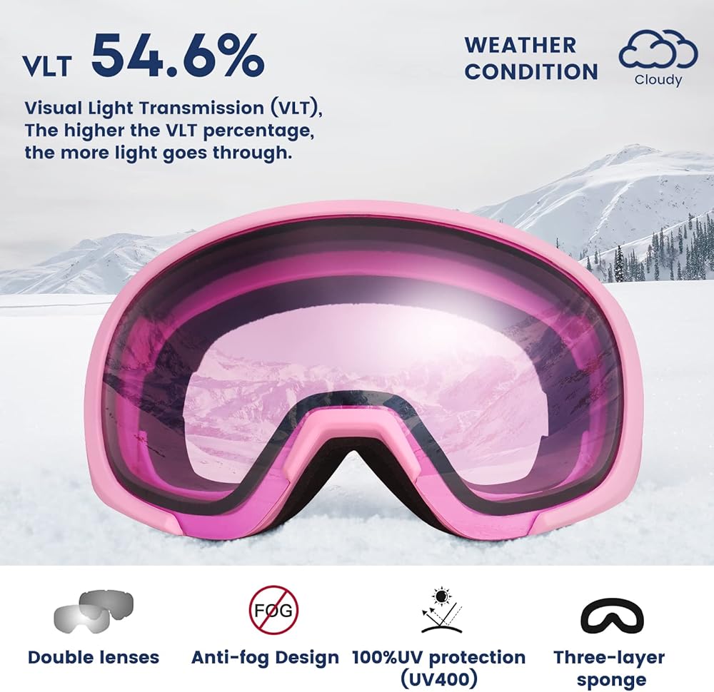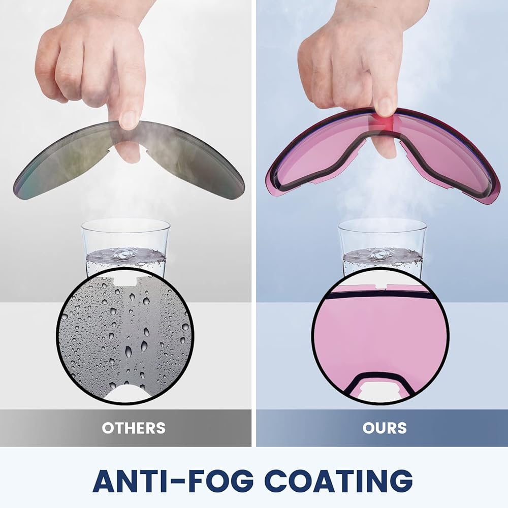 • تصميم مضاد للضباب: نظارات التزلج مجهزة بعدسات مزدوجة لفصل البرد الخارجي عن حرارة درجة الحرارة الداخلية، بالإضافة إلى طلاء مضاد للضباب على السطح الداخلي للعدسة الداخلية، يمكن لنظارات التزلج مقاومة الضباب حتى أكثر فعالية.