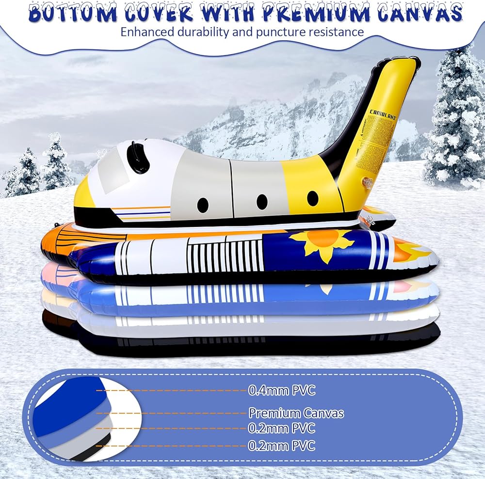 ❄ مادة كلوريد متعدد الفاينيل: أنبوب الثلج مصنوع من مادة البولي فينيل كلوريد فائقة السماكة بسمك 0.6 مم. السبب في أننا نختار المادة السميكة للغاية هو أن الجزء السفلي والجانب مصنوعان من أداء التآكل ومقاومة للخدش. لقد أصبح مضاد للتسرب والتمزق ومقاوم للماء بسبب تقنية الصهر المتطورة السلسة. بالإضافة إلى ذلك، تسمح لك ميزة الطلاء الخاصة بالانزلاق بحرية وسرعة في الثلج.