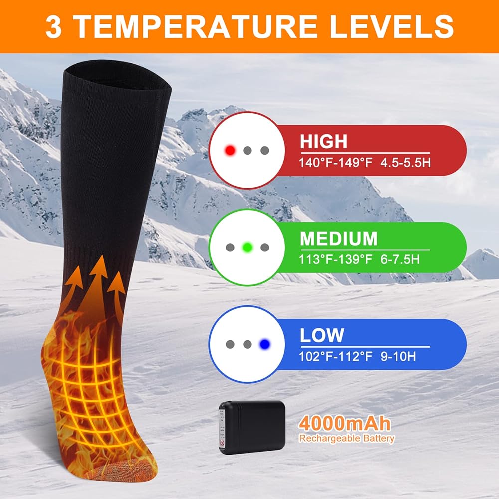 【LONG-LASTING UPGRADED BATTERY】 The battery-heated socks can last for up to 4 hours on the highest setting and 9 hours on the lowest heat setting, so you don't have to worry about the power running out too soon. With consistent charging, you can even enjoy using your electric heated socks for extended periods without any problems. Feel free to go on long walks or travel while these electric warm socks keep your feet comfy all the time.