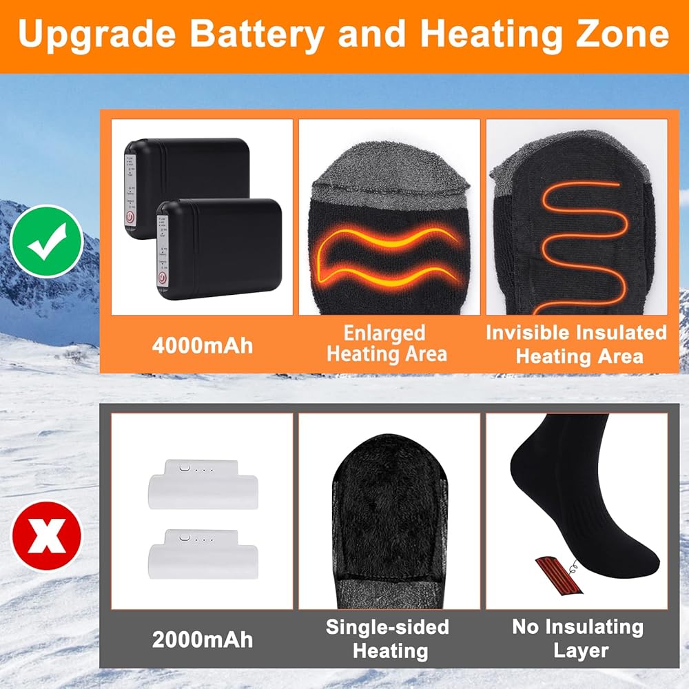 【UPGRADE HEATING ELEMENTS】Compared with traditional rechargeable electric socks, our heated socks feature an embedded heating element integrated within the sock, which concentrates heat evenly across the entire foot. This design promotes rapid and uniform warmth, encompassing 360 degrees around the foot. As a result, it encourages good blood circulation and ensures optimal warmth.