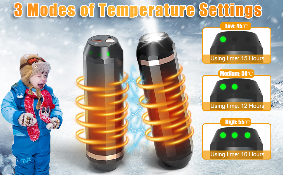 تسخين سريع لمدة 3 ثوانٍ ووقت عمل طويل: تحتوي أجهزة تدفئة اليد الساخنة على ثلاثة أوضاع لدرجة الحرارة: عالية 131 درجة فهرنهايت/55 درجة مئوية، متوسطة 122 درجة فهرنهايت/50 درجة مئوية، منخفضة 113 درجة فهرنهايت/45 درجة مئوية. يمكن شحنه بالكامل خلال 3-5 ساعات ويمكن أن يستمر في التسخين لمدة 6-15 ساعة، اعتمادًا على مستوى درجة الحرارة الذي تختاره ودرجة الحرارة البيئية الخارجية.