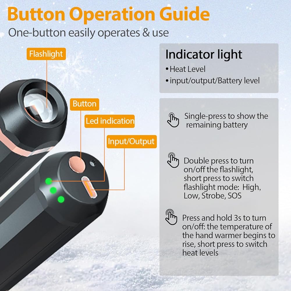 أجهزة تدفئة اليد 3 في 1 قابلة لإعادة الشحن: تم تجهيز أجهزة تدفئة اليد ببطارية مدمجة قابلة لإعادة الشحن بقدرة 10000 مللي أمبير في الساعة، والتي يمكن أن تكون بمثابة بنك طاقة كبير السعة لتشغيل الأجهزة مثل الهواتف المحمولة. كما أن لديها وظيفة مصباح يدوي. يحتوي المصباح اليدوي على 4 أوضاع، و2 سطوع، وضوء SOS، وضوء تحذير. يمكن استخدام أجهزة تدفئة اليد الكهربائية 3 في 1 القابلة لإعادة الشحن كجهاز طوارئ.