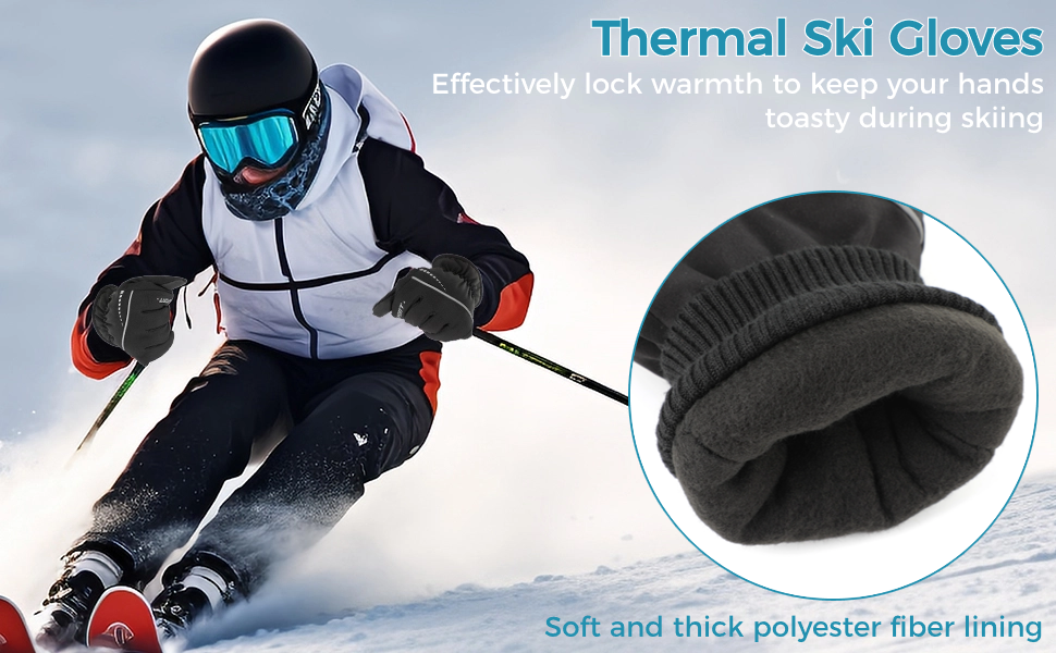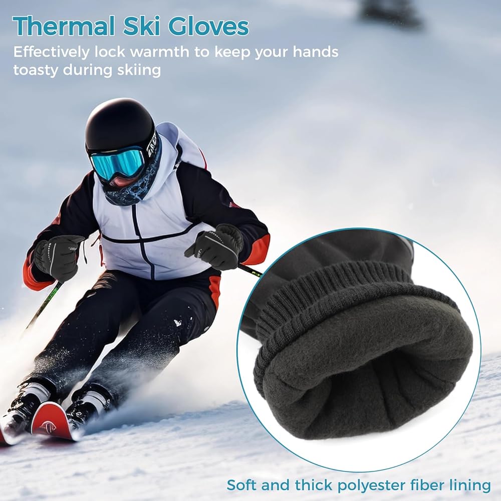 【ألياف بوليستر فائقة الحرارة】 مصنوعة من بطانة سميكة من ألياف البوليستر، توفر قفازاتنا ملاذًا ناعمًا ومريحًا ليديك. حافظ على الدفء ويحمي من قضمة الصقيع، واستمتع بحريتك في التزلج دون قلق!