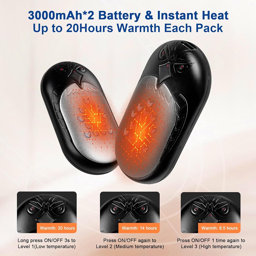 دفء يدوم طويلاً مع بطارية 6000 مللي أمبير في الساعة: بطارية مدمجة 3000 مللي أمبير في الساعة*2، يمكن أن تدوم أجهزة تدفئة اليد القابلة لإعادة الشحن هذه لمدة تصل إلى 20 ساعة من الدفء لاستخدام العبوة المزدوجة، وما يصل إلى 40 ساعة لاستخدام العبوة الواحدة. تجلب لك الدفء المستمر طوال اليوم