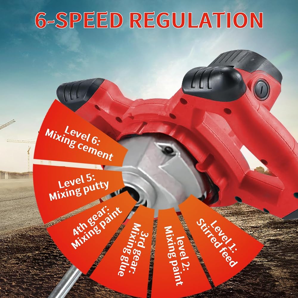 6 سرعات عمل قابلة للتعديل: آلات خلط الخرسانة مع 6 مستويات سرعة قابلة للتعديل، (1-2-3-4-5-6) (0-800 دورة/دقيقة)، يمكن أن تلبي سرعات خلط مختلفة لمجموعة واسعة من المواد (الخرسانة والطلاء وطين الحوائط الجافة والجص والملاط والمزيد) بسهولة. فهو لا يجعل الخرسانة يتم خلطها بسرعة وبشكل متساوٍ فحسب، بل يتجنب أيضًا تناثر المواد المختلطة بسبب السرعة المفرطة.
