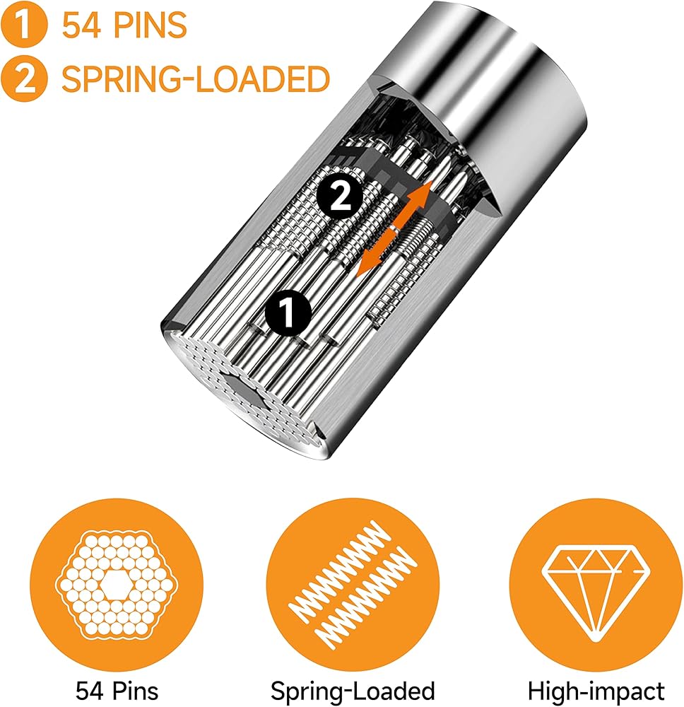 🎁【هدايا الأب من ابنة الابن والزوجة】مجموعة مقابس عالمية تمت ترقيتها من مادة فولاذية عادية إلى فولاذ فاناديوم كروم عالي الصلابة، وتحتوي على 54 دبابيس زنبركية فولاذية. القضبان الفولاذية فائقة القوة زنبركية بشكل فردي مما يسمح للمقبس بالتوافق تلقائيًا مع أي شكل على الفور، والانتقال إلى أنواع مختلفة من أدوات التثبيت دون تغيير كل المقابس، مما يسمح لك ببدء العمل بسهولة. أداة هدايا المقبس هي اليد الثالثة الفريدة لتكمل عملك الجاد