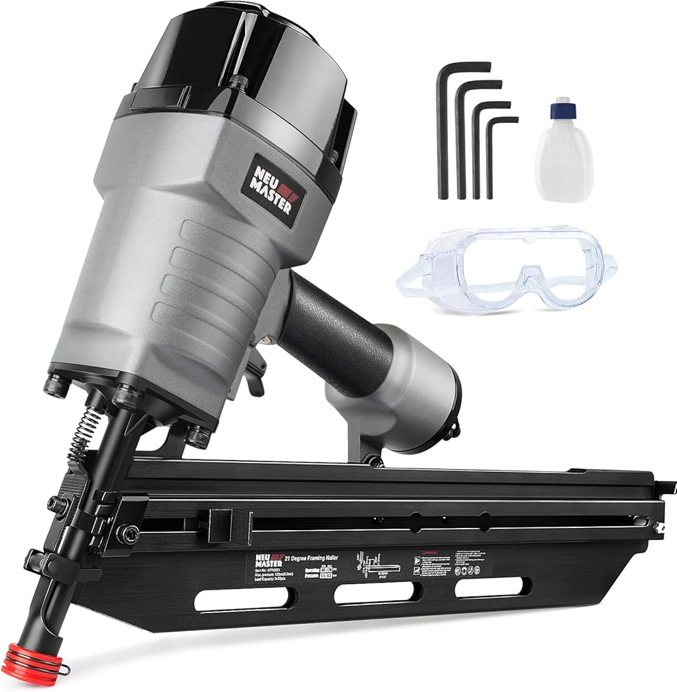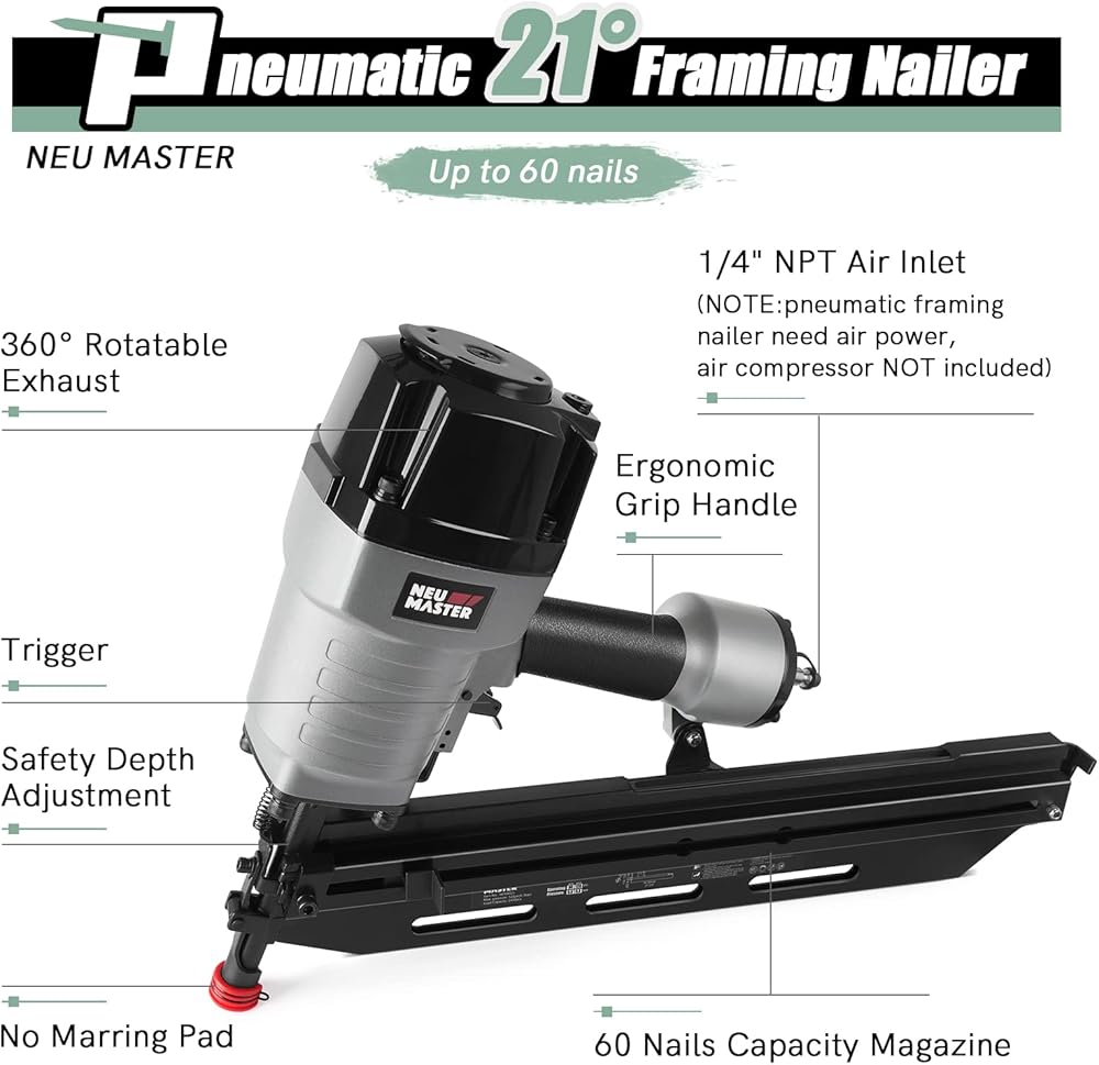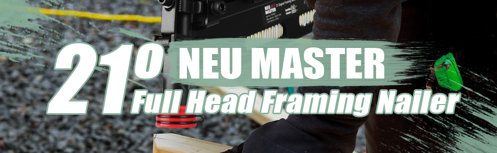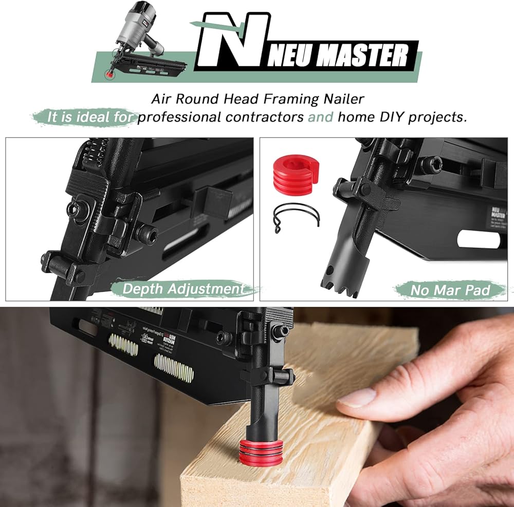 مسمار الإطار الهوائي 21 درجة من إن يو ماستر، مسدس أظافر مريح بإطار مع عمق خالٍ من الأدوات قابل للتعديل وبدون طرف لتحديد المسار، يقود الأظافر من 5.08 سم إلى 8.89 سم