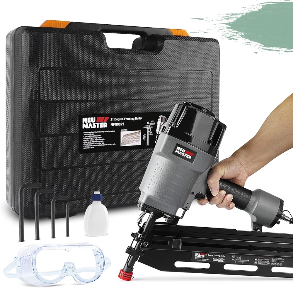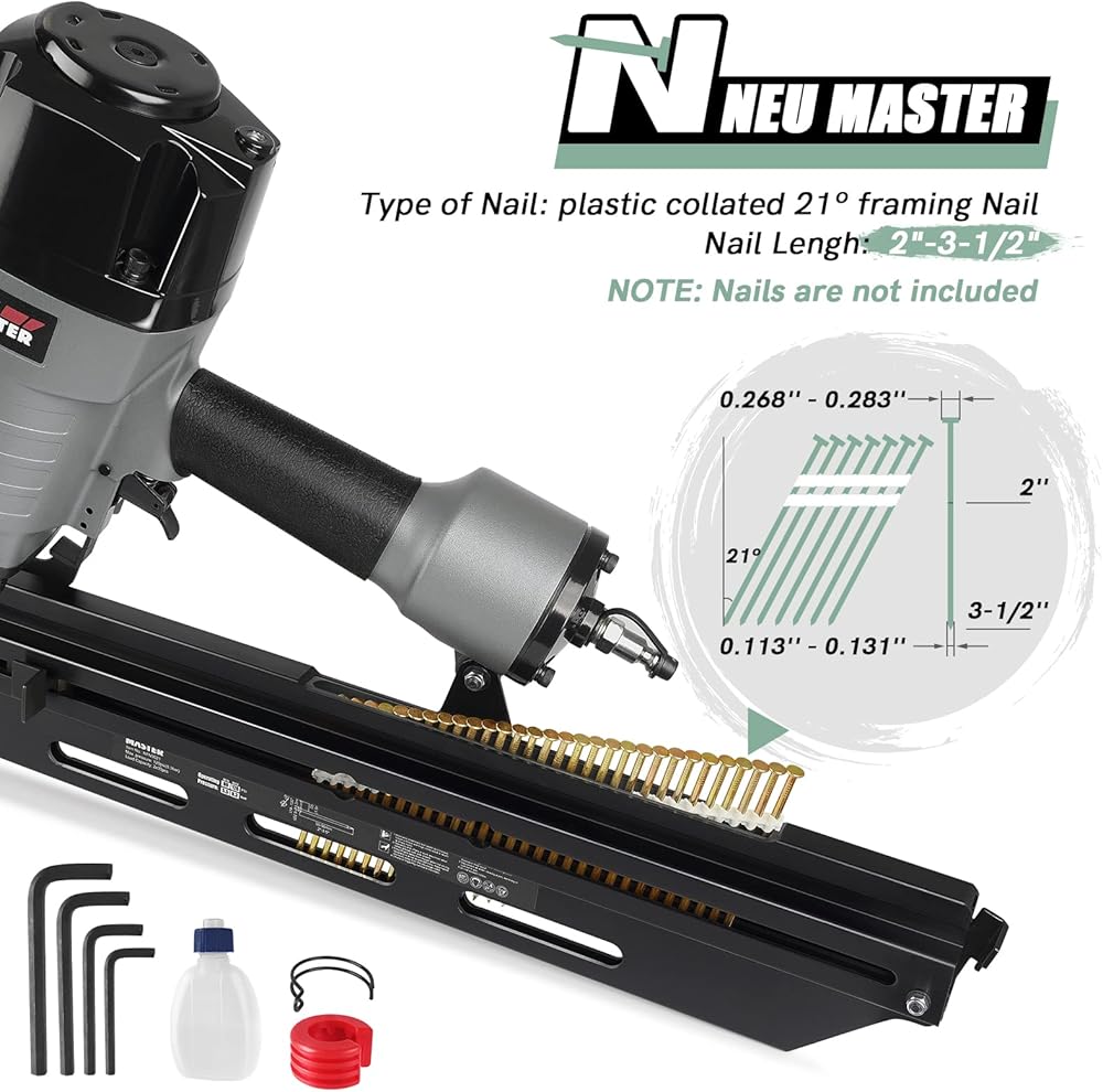 مسمار تأطير هوائي متوافق مع 21 درجة من البلاستيك الملتف بالكامل برؤوس مستديرة 2 بوصة حتى 3-1/2 بوصة. استوف احتياجات أنواع متعددة من الأعمال الخشبية. ملحوظة: يحتاج مسمار تأطير هوائي إلى ضاغط هوائي ، ولكن طقم الأظافر الإطار لا يشمل ضاغط الهواء.
