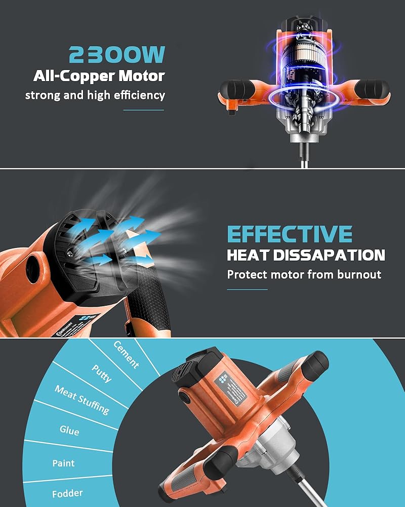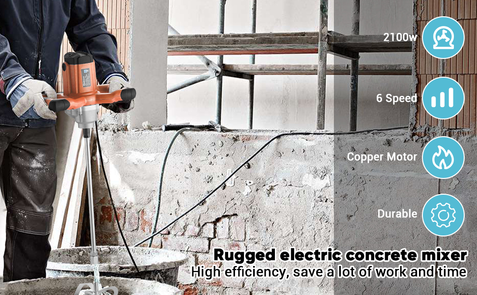 【محرك قوي مطور】يعتمد خلاط الخرسانة الكهربائي المحمول الخاص بنا على محرك نحاسي 2300 واط/110 فولت، وهو أكثر قوة وكفاءة أعلى وأكثر أمانًا. 270-900 دورة في الدقيقة، مناسب لخلط مجموعة متنوعة من المواد، مثل الخرسانة، الجص، الطين، الطلاء، الملاط، الملاط، المعجون، اللحم المفروم، إلخ.