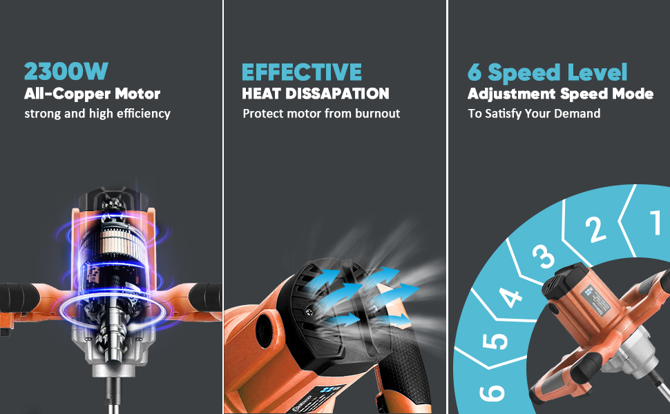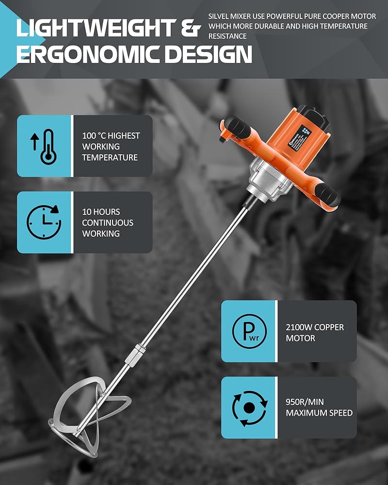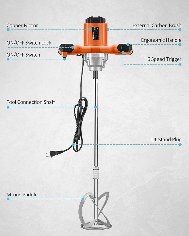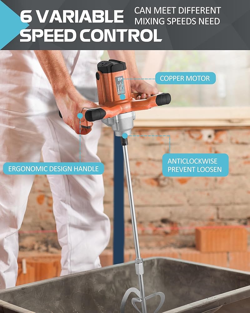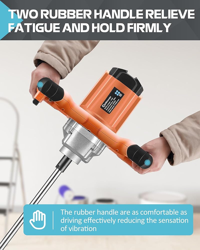 【تصميم إنساني】يتميز خلاط الطين بتصميم مقبض مزدوج لعجلة القيادة، مما يجعله مريحًا في الإمساك ويحافظ دائمًا على الخلاط في أفضل وضع للاستخدام. يحتوي خلاط الخرسانة الكهربائي المحمول هذا على مفتاح قفل ذاتي، ولا حاجة للضغط على الزناد أثناء العمل، مما يقلل من كثافة العمل وتعب الأصابع.