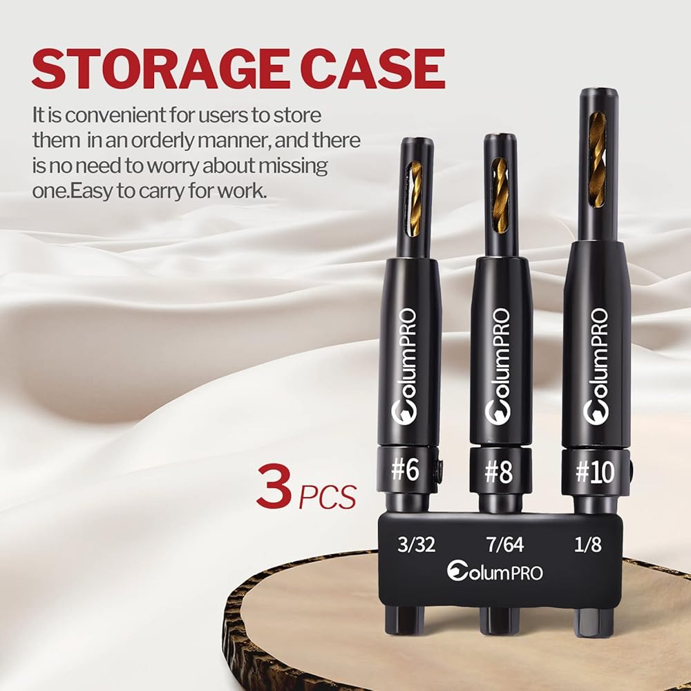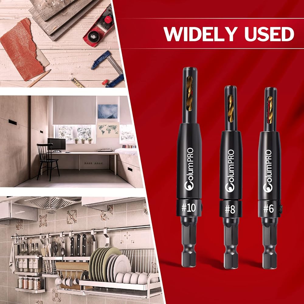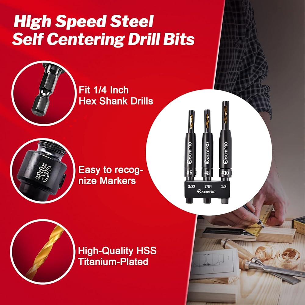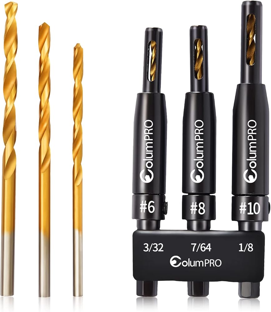 ColumPRO 3 قطع HSS المفصلي الذاتي توسيط الحفر VIX بت مجموعة، التيتانيوم تصفيح كونترسينك اليد اليسرى مجموعة لقم الحفر، باب نافذة خزانة النجارة الطيار ثقب مثقاب 3/32 "(#6)، 7/64"(#8)، 1/8" (#10)