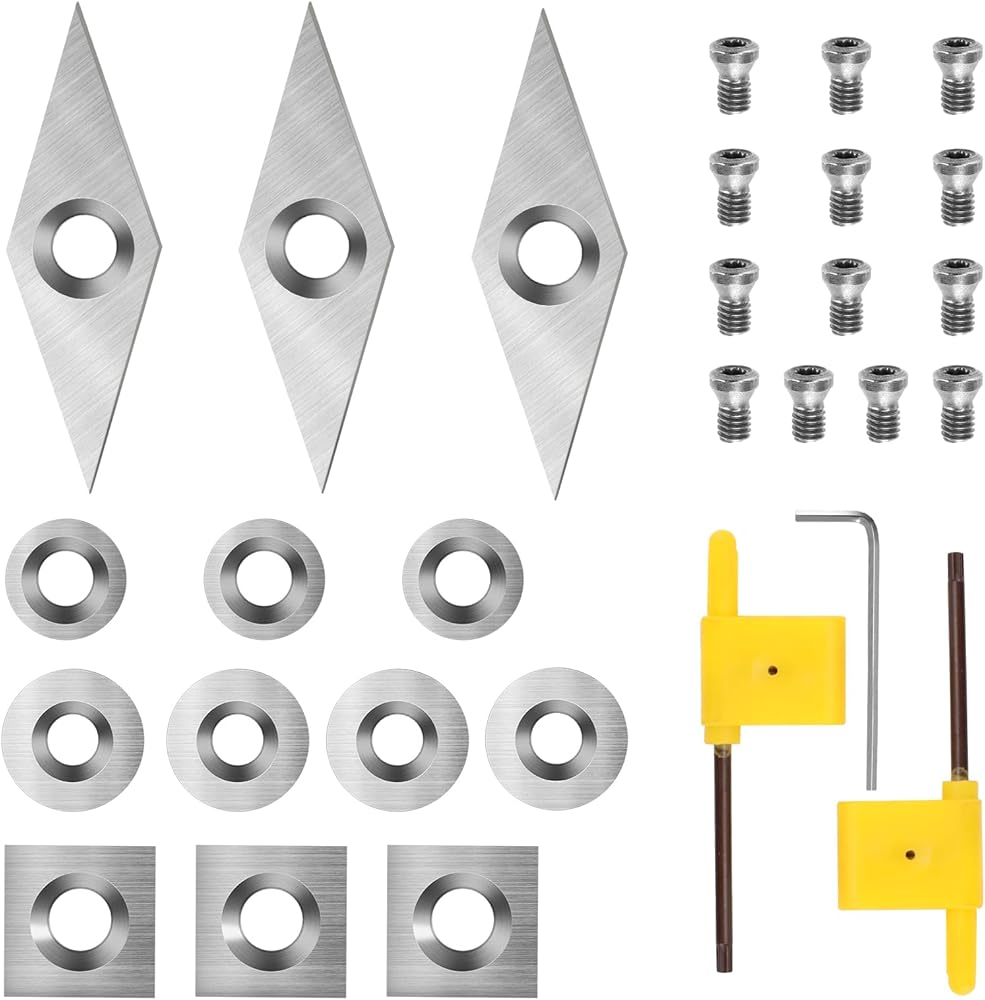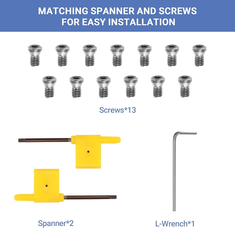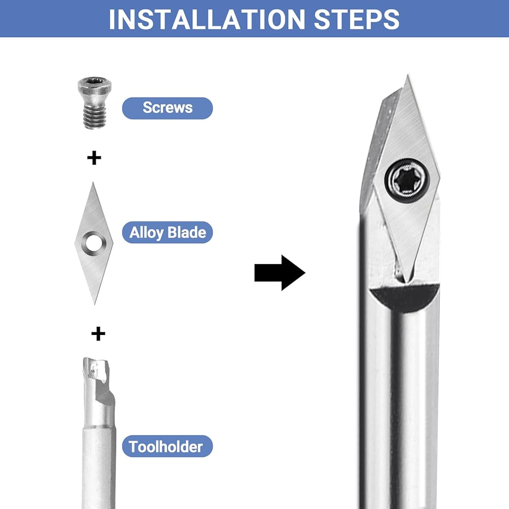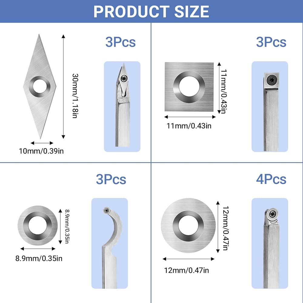 【Carbide Lathe Tools】: Set includes replacement tips, screws, and wrenches, designed to fit most sizes including 11 mm Square with Radius, 12 mm and 8.9 mm Round, and 30 x 10 mm Diamond.
