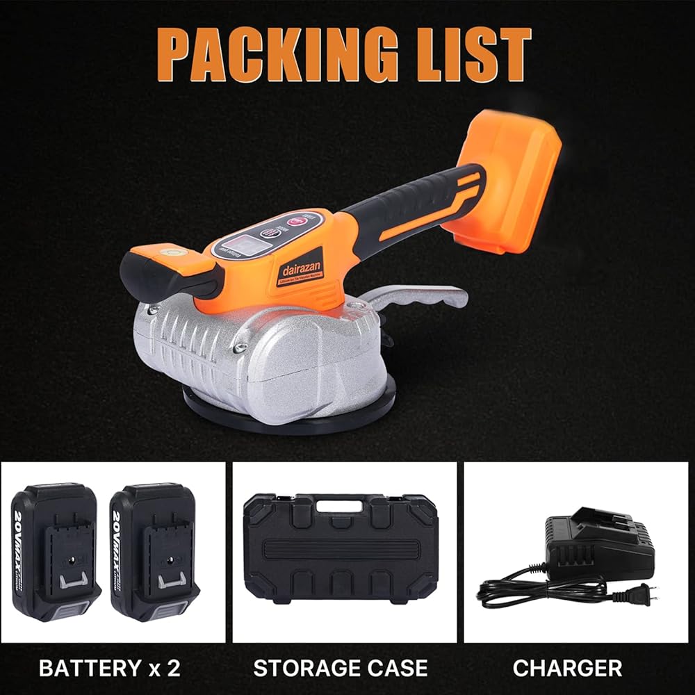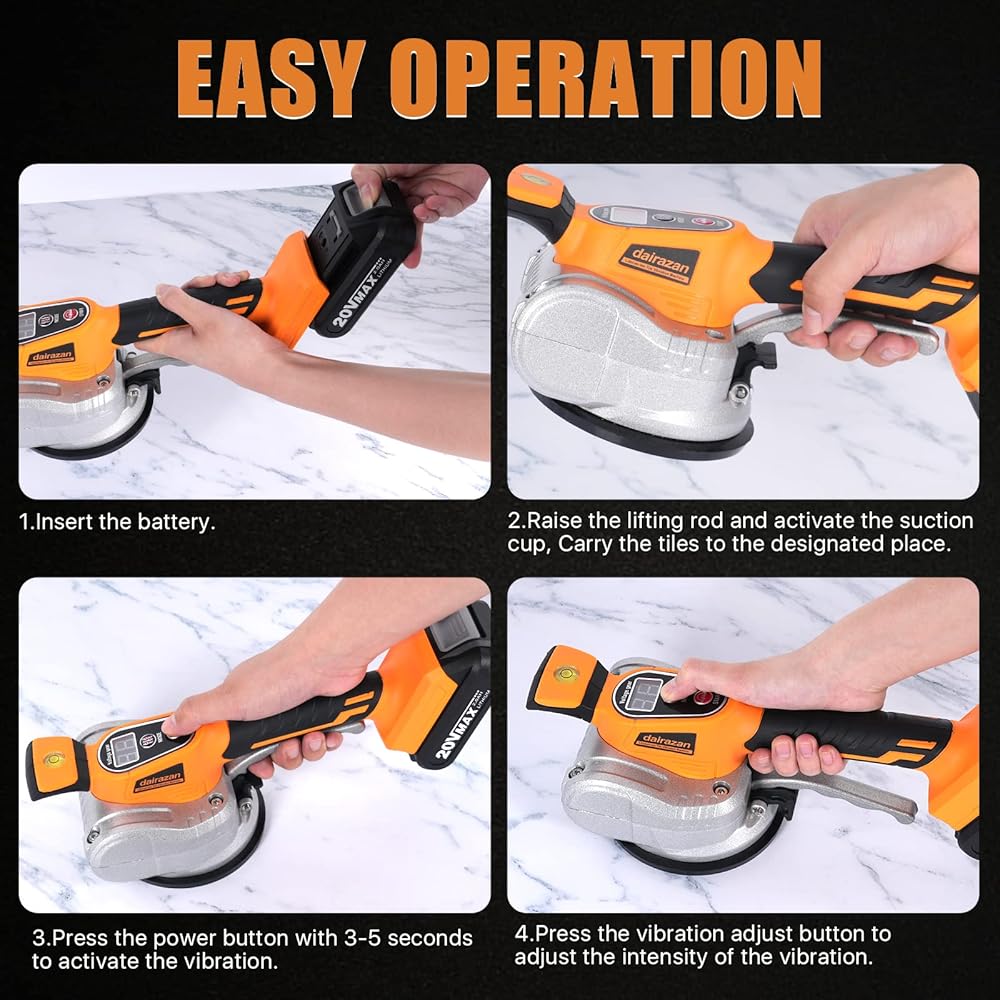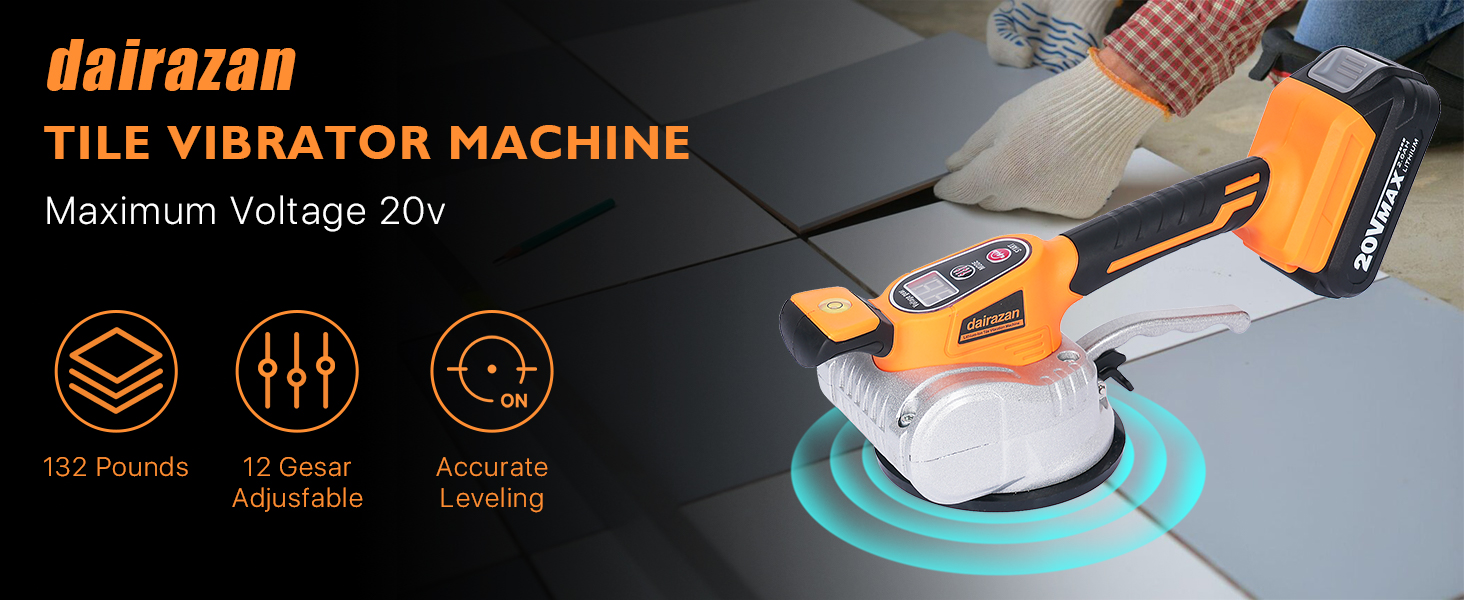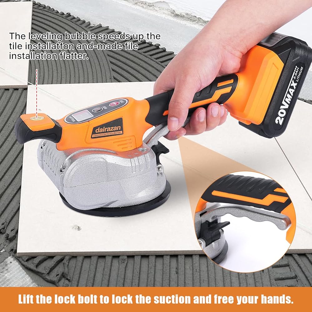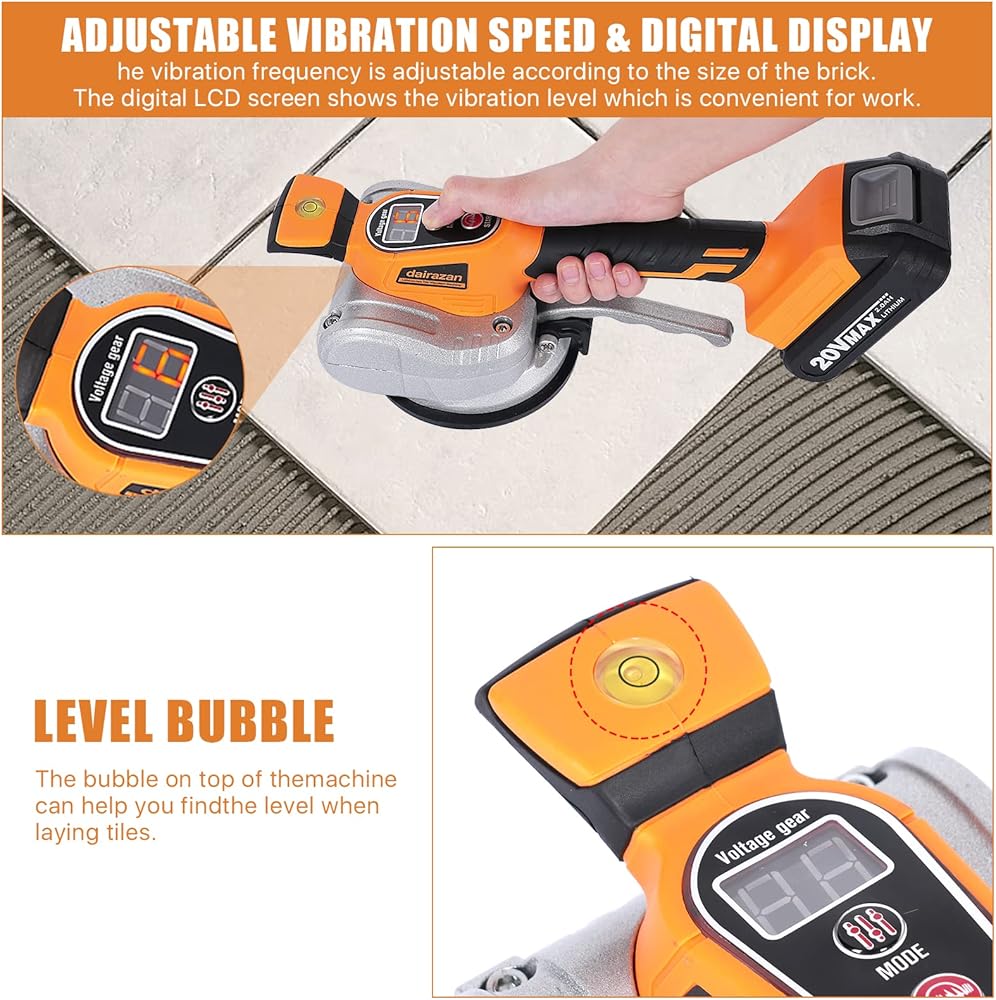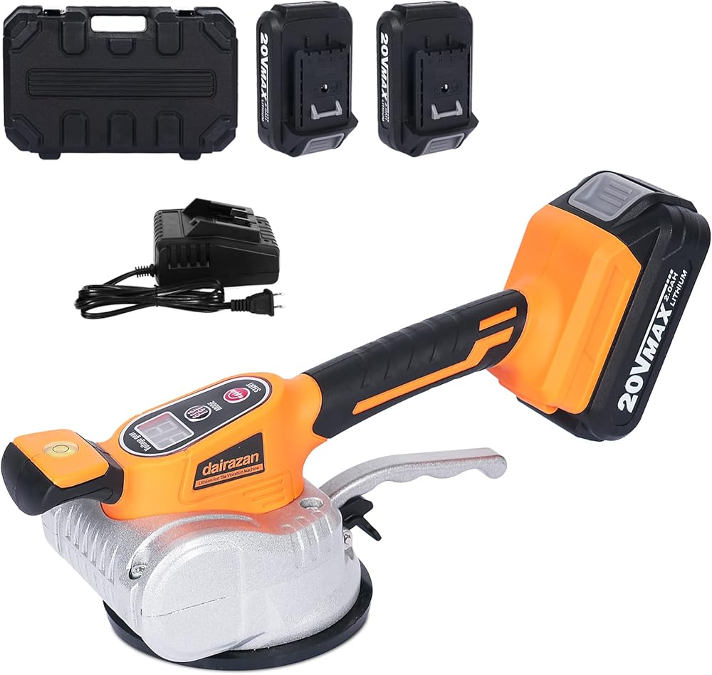 آلة تسوية الاهتزاز للبلاط من dairazan أداة اهتزاز قابلة للتعديل - بلاط مع كوب شفط 12 سرعة قابلة للتعديل وشاشة رقمية، بطارية 20 فولت قطعتان 2000 مللي أمبير في الساعة