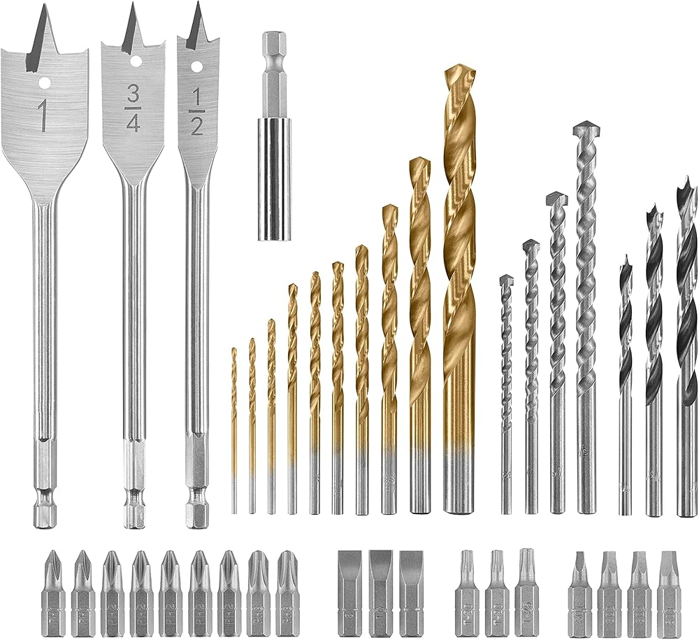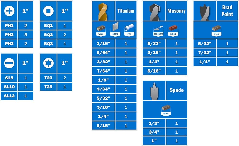- يشمل: (1) رؤوس قيادة العلبة: (2) 1 بوصة PH1 (5) 1 بوصة PH2 (2) 1 بوصة PH3 (1) 1 بوصة SQ1 (2) 1 بوصة SQ2 (1) 1 بوصة SQ3 (1) 1 بوصة SL8 (1) 1 بوصة SL8 (1) 1 بوصة SL10 (10) () 1 انش SL12 (2) 1 انش T20 (1) 1 انش T25 لقم ثقب: التيتانيوم (1) 1/16 انش (1) 5/64 انش (1) 3/32 انش (1) 7/64 انش (1) 1/8 انش سم (1) 99 سم /64 انش (1) 5/32 انش (1) 3/16 انش (1) 1/4 انش (1) 5/16 انش (1) 5/32 انش (1) 3/16 انش (1) 1/4 انش (1) 5/4 انش (1) 5/4 0.2 بوصة 0.2سبيد (1) 1/2 انش (1) 3/4 انش (1) 1 انش براد بوينت (1) 5/32 انش (1) 7/32 انش (1) 1/4 انش أخرى: (1) حامل لقم مغناطيسي 2-3/8 انش