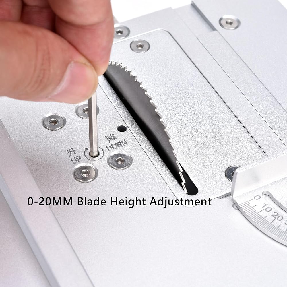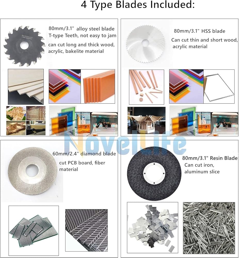 ★Blade Height Adjustment and Various Material Cutting Capacity★ Euquipped with blade height adjustment structure with 0-30mm range and equipped 4" HSS circular saw blade, 4" diamond saw blade and 4" alloy saw blade for PCB board,plastic, PVC, wood,balsa,acrylic material cutting to meet your DIY crafts demands