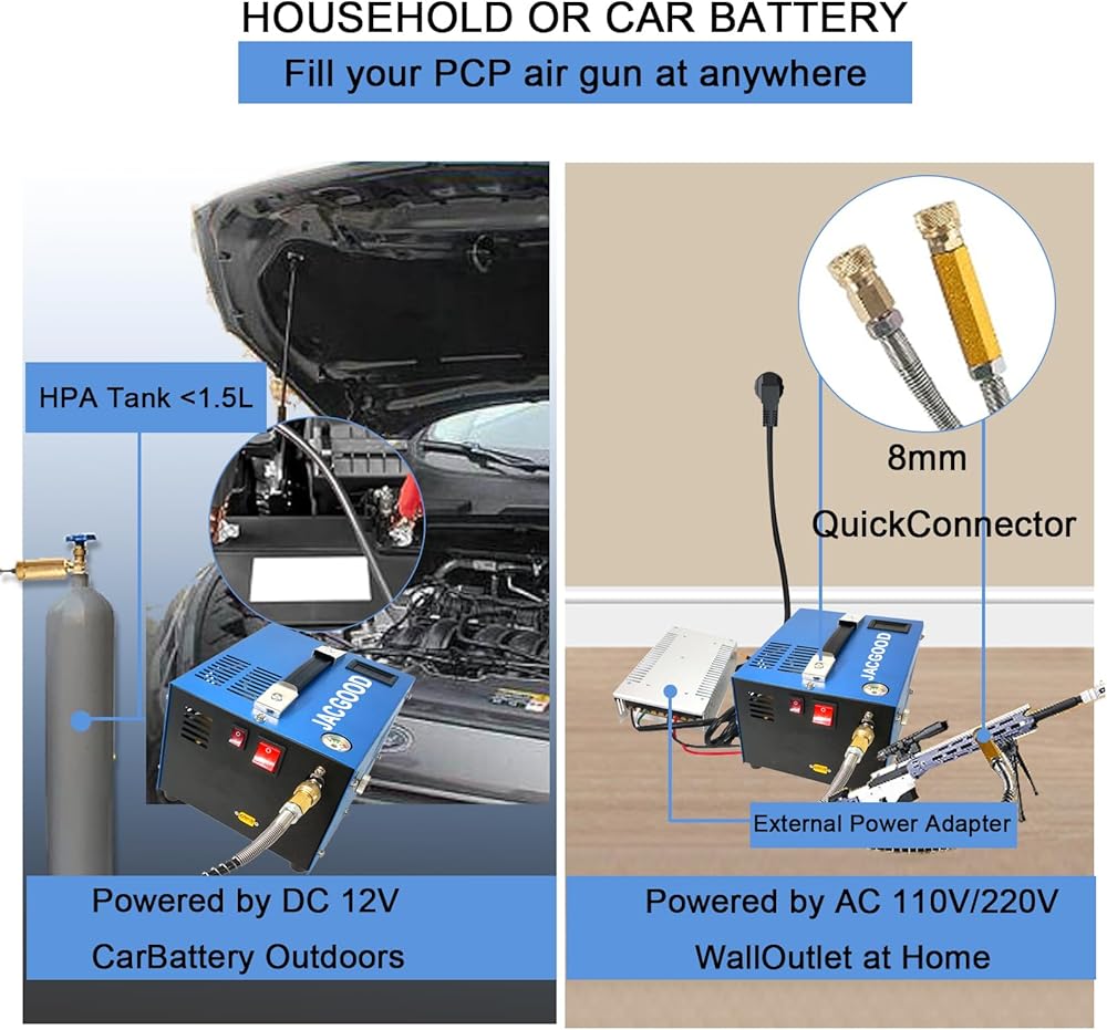 【طاقة المنزل أو السيارة】يمكن تشغيل ضاغط PCP المحمول ببطارية سيارة 12 فولت في الهواء الطلق أو مقبس 110 فولت في المنزل باستخدام محول خارجي (متضمن). من المريح جدًا ملء مسدس الهواء PCP أو خزان كرات الطلاء في أي مكان. الحد الأقصى لخزان النفخ هو 0.25 جالون/1 لتر. سيستغرق الخزان سعة 0.5 لتر 18 دقيقة من 0 إلى 300 بار و5 دقائق من 200 إلى 300 بار.