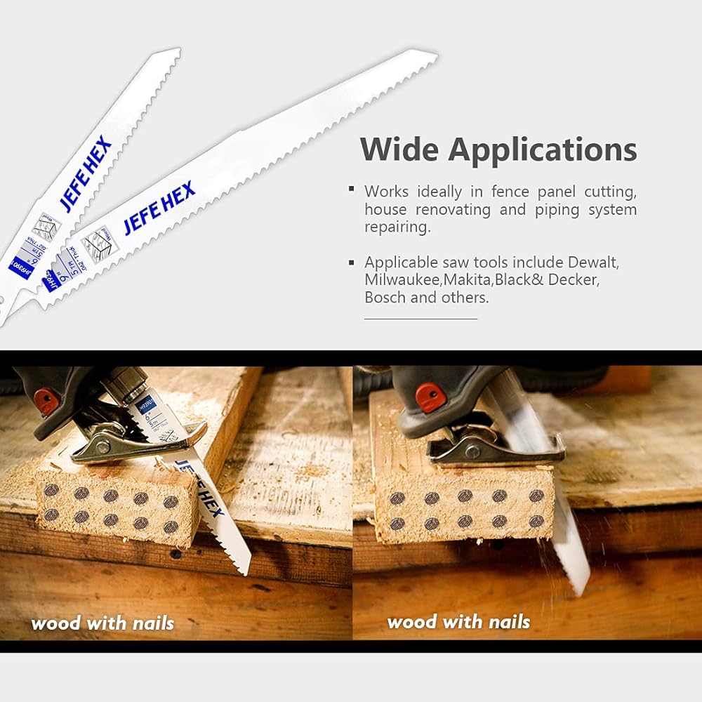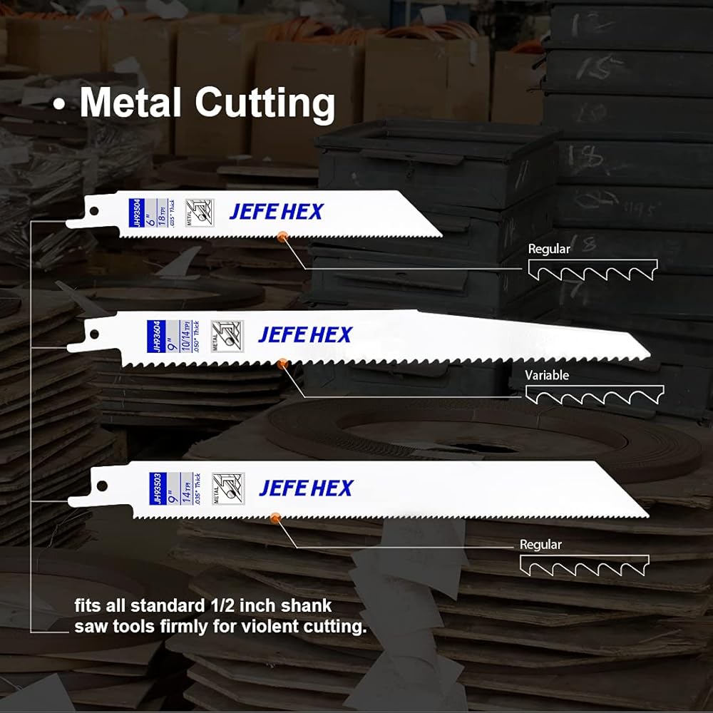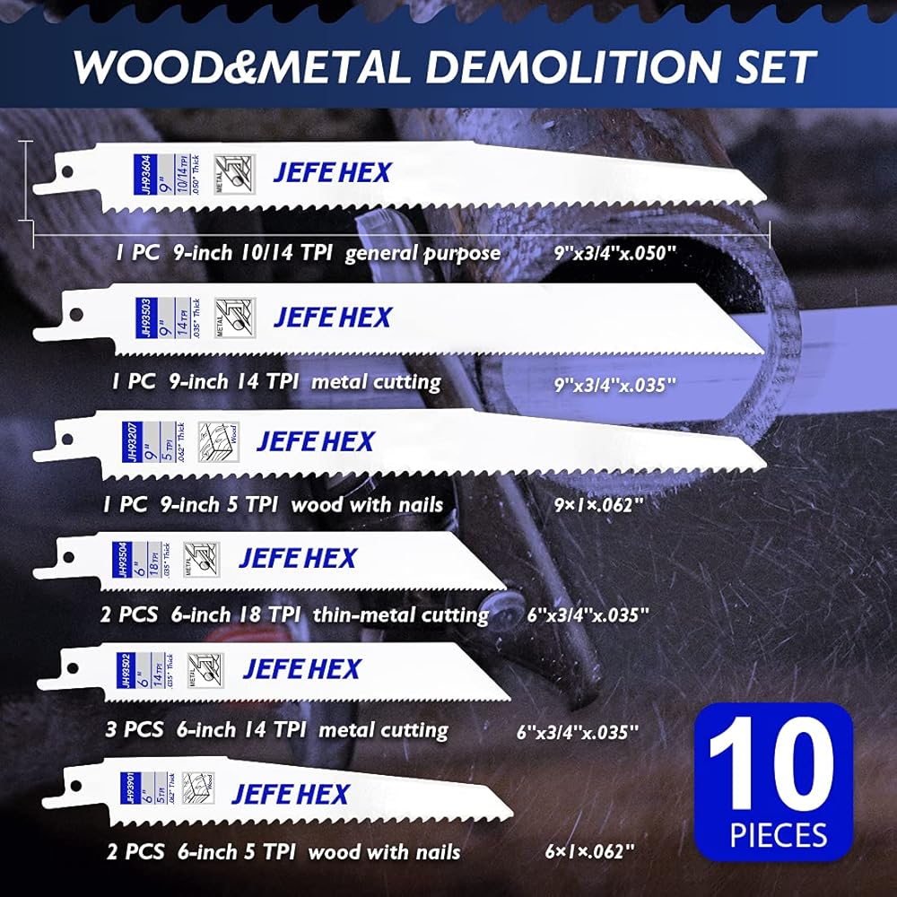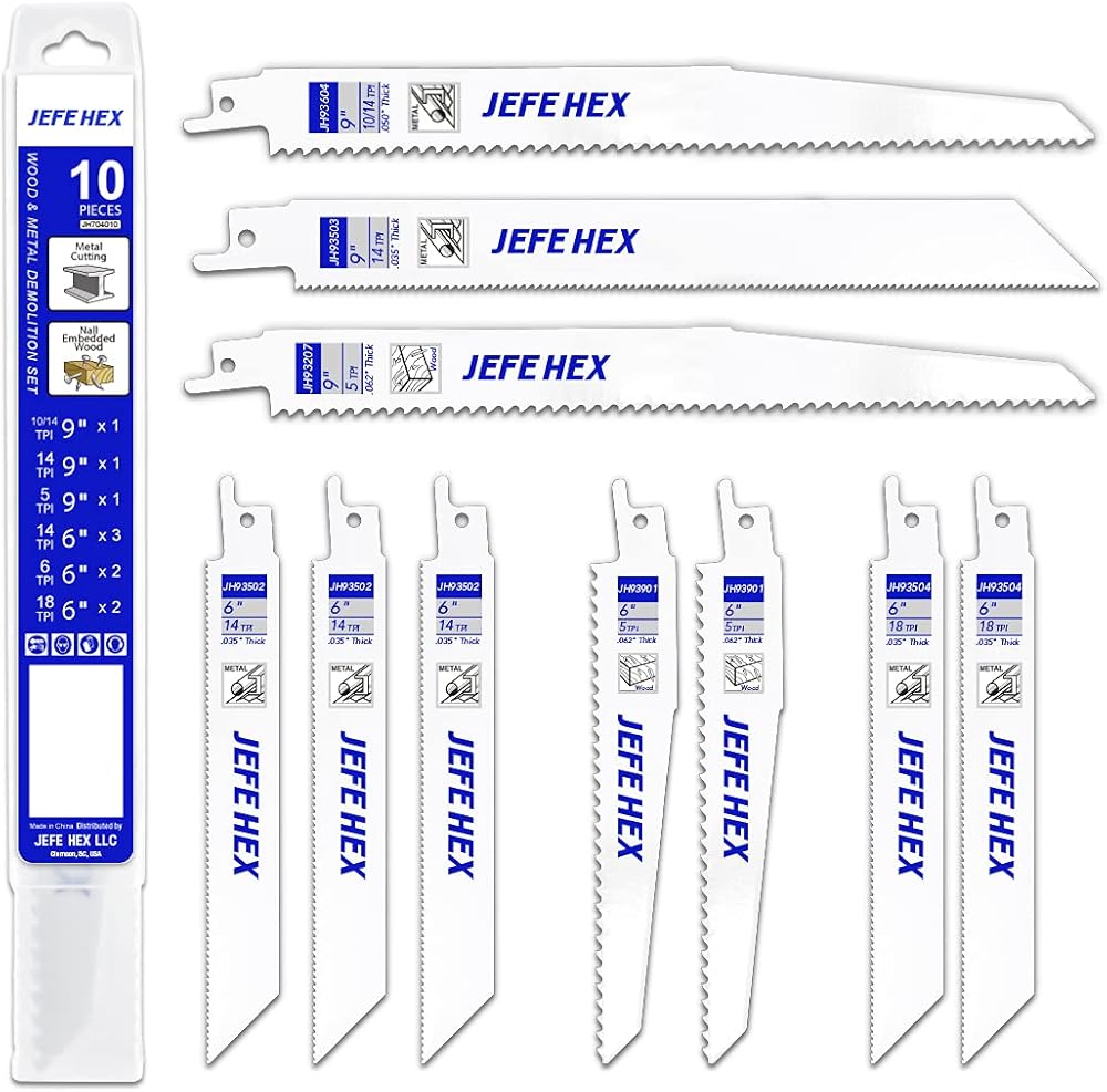 مجموعة شفرات المنشار الترددية المكونة من 10 قطع من JEFE HEX، مجموعة شفرات منشار الكوبالت ثنائية المعدن مقاس 6 إلى 9 بوصة، قطع معدنية شديدة التحمل، تقليم الخشب ومتعددة الأغراض