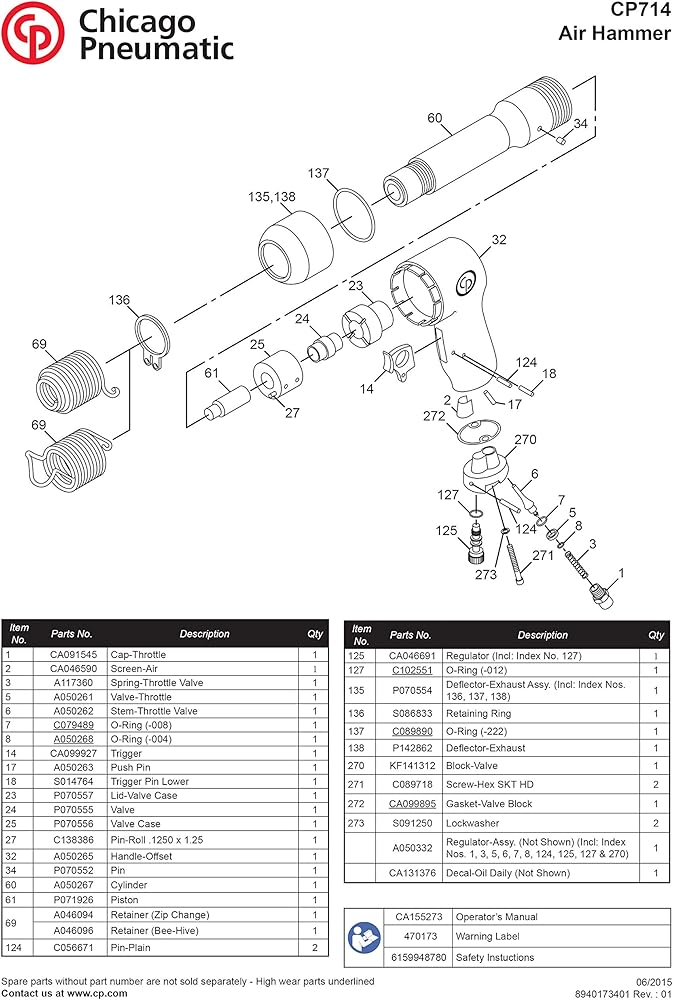 جميع مكونات وملحقات شيكاغو الهوائية الأصلية بما في ذلك (1) مطرقة هوائية CP714، (1) ظرف تغيير كتكوت CA155807 و(1) مجموعة إزميل 8940158924 6 قطع