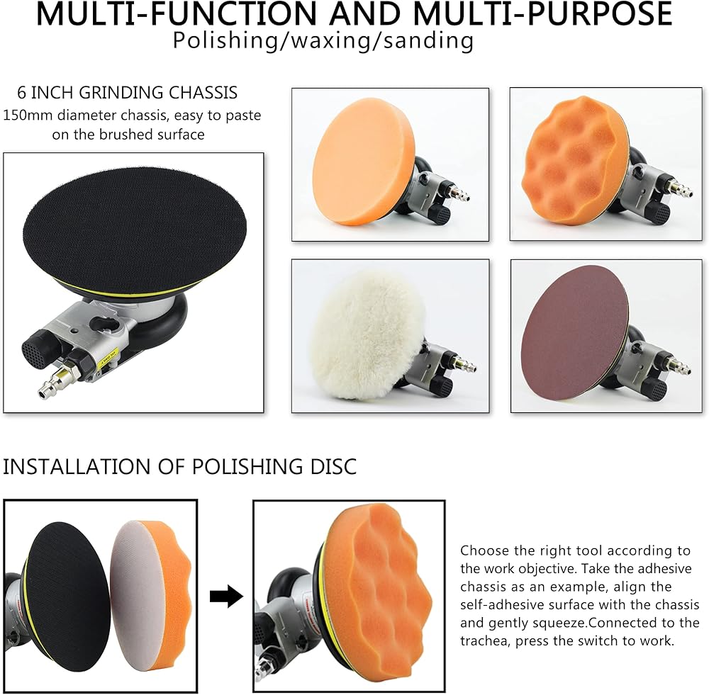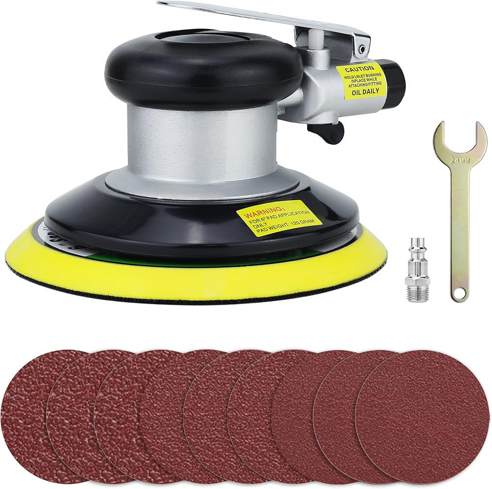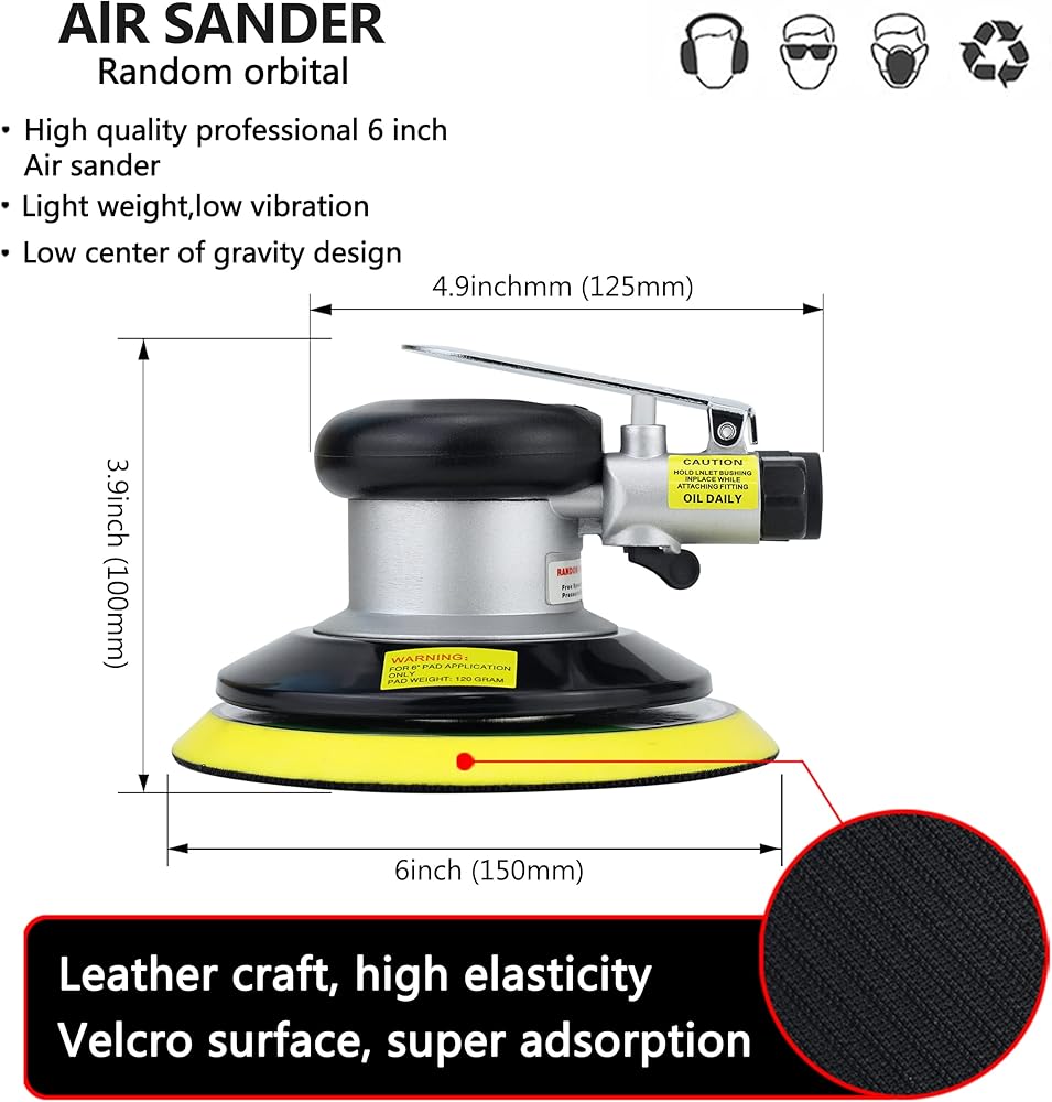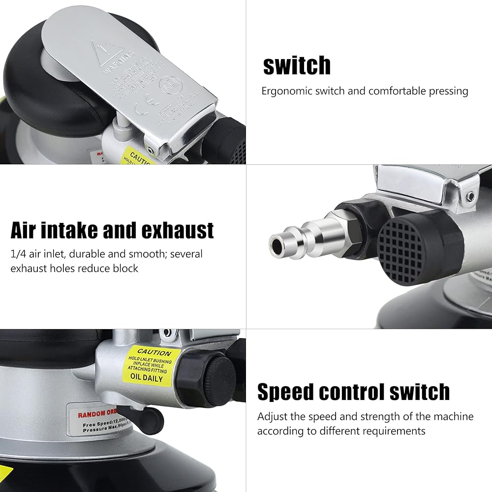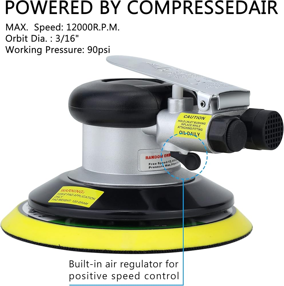 Professional high performance dual action random orbit pneumatic sander. High speed and powerful, Free speed can reach 15,000 revolutions per minute, 90 PSI Air Pressure.