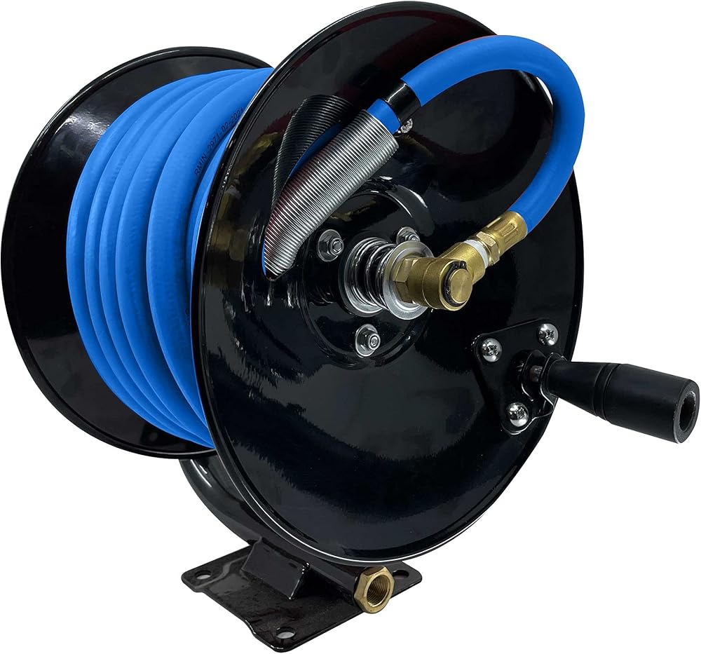 بكرة خرطوم هواء يدوية مقاس 3/8 بوصة × 50 بوصة - خرطوم مطاطي من بلو بيرد، بكرة: - بكرة فولاذية شديدة التحمل مقاس 18 بوصة مع لمسة نهائية من مسحوق الطلاء، قابلة للتركيب على الحائط ومنضدة العمل، آلية فك وترجيع سلسة، تحمل ما يصل إلى 3/8 بوصة × خرطوم هواء بطول 50 قدم، مقبض مريح لسهولة الاستخدام، واقي زنبركي لمقاومة مكامن الخلل والأضرار، الخرطوم: - الأخف - الأقوى - الأكثر مرونة. أخف بنسبة 40% من الخراطيم المطاطية الأخرى، مرنة للغاية في -50 درجة فهرنهايت، ضمان 10 سنوات، مقاوم للأوزون والأشعة فوق البنفسجية.، مخرج - 3/8 بوصة M-NPT ومدخل 3/8 بوصة F-NPT + 1 × 3/8 مخفض NPT "NPT إلى 1/4" لتوصيل مجموعة متنوعة من الأدوات، 300 رطل لكل بوصة مربعة W.P. 1200 رطل لكل بوصة مربعة، أخيرًا، خرطوم مطاطي أخف بنسبة 40% من الأنواع الأخرى وخفيف الوزن مثل الخراطيم الهجينة/PVC. وهي أقوى من أفضل الخراطيم المطاطية. سهولة الاستخدام: يتم وضعه بشكل مسطح، ولا ينثني تحت الضغط، ولا يصبح لزجًا أو متسخًا مثل الخراطيم البلاستيكية والهجينة، وهو أسهل بكثير في التنظيف.