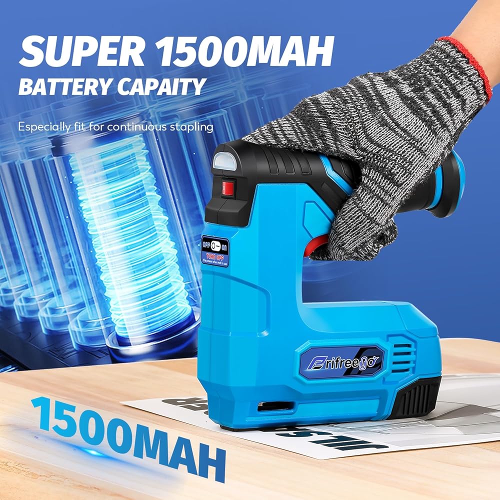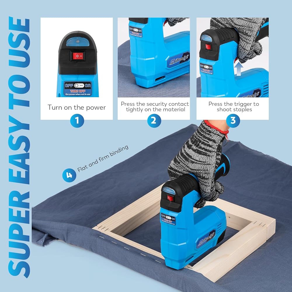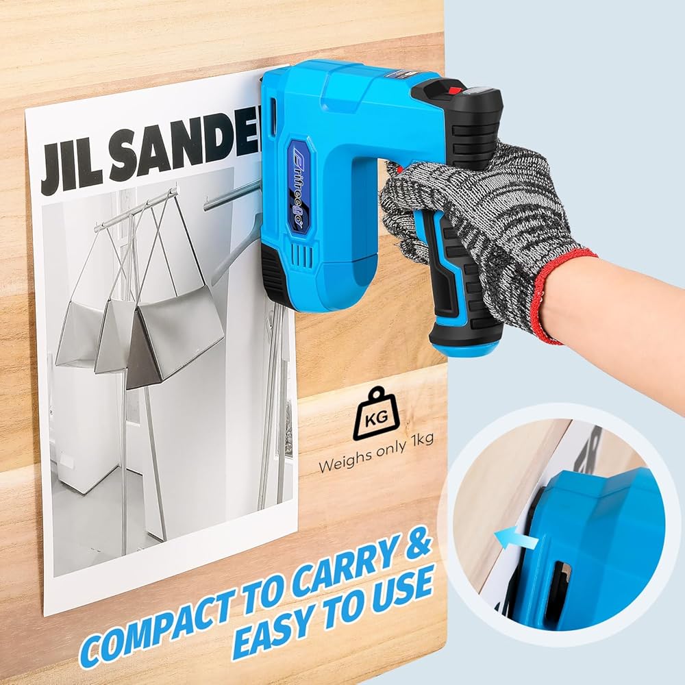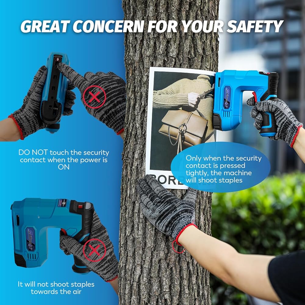 SUPER SAFE DESIGN: We seriously take your safety into consideration. This electric nail gun has a safety contact on the head. The machine can only be used when the safety contact is pressed firmly against the binding material, which effectively ensures your safety.