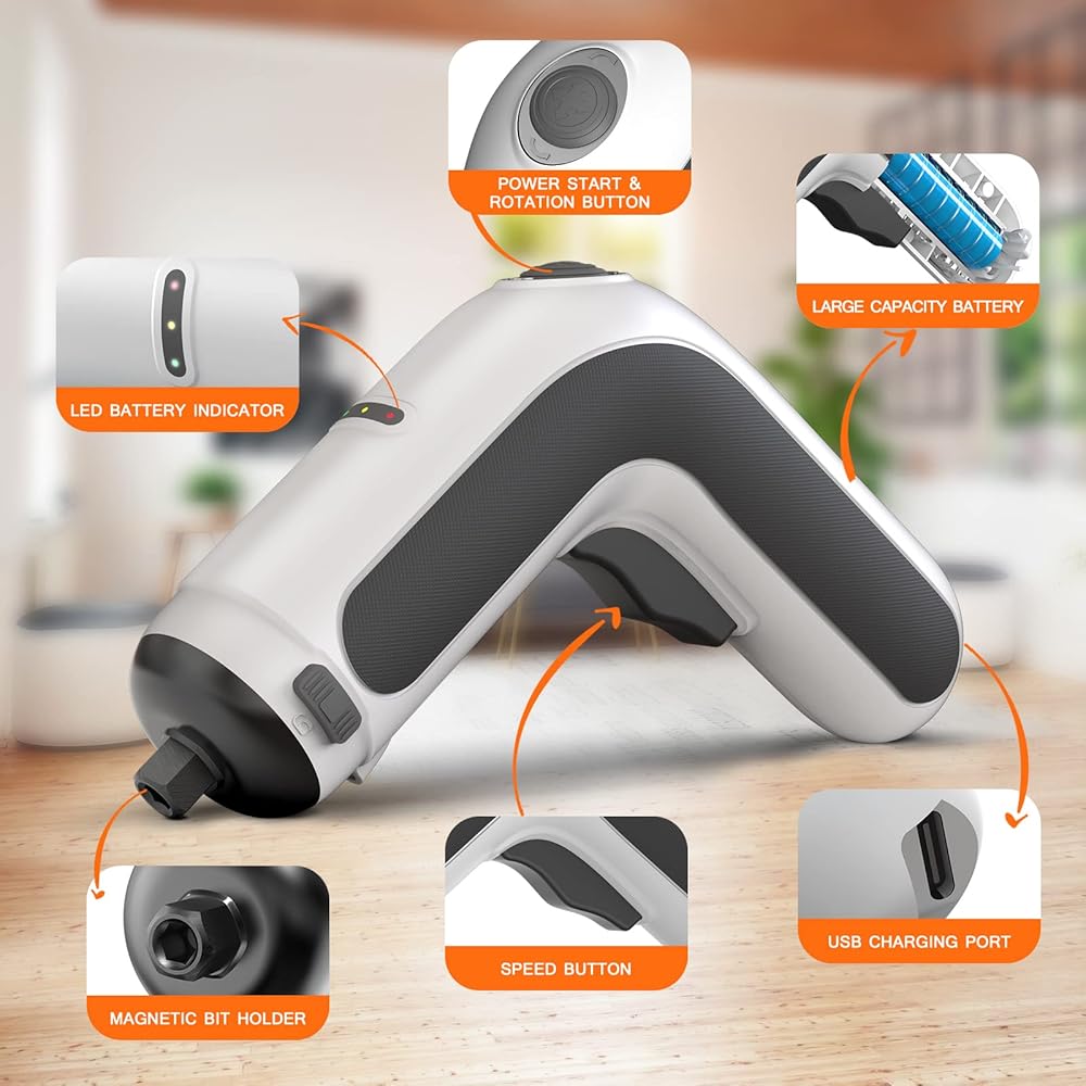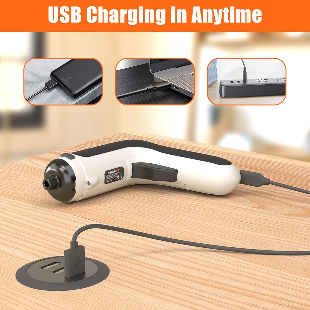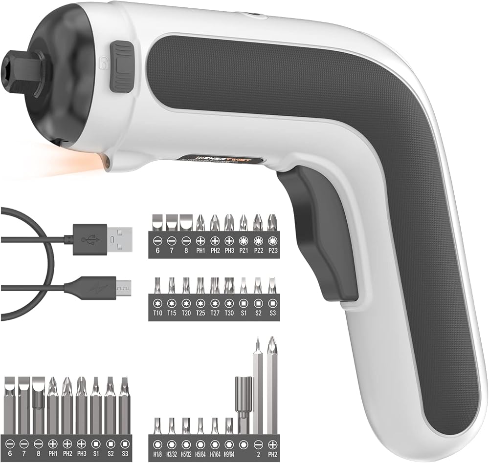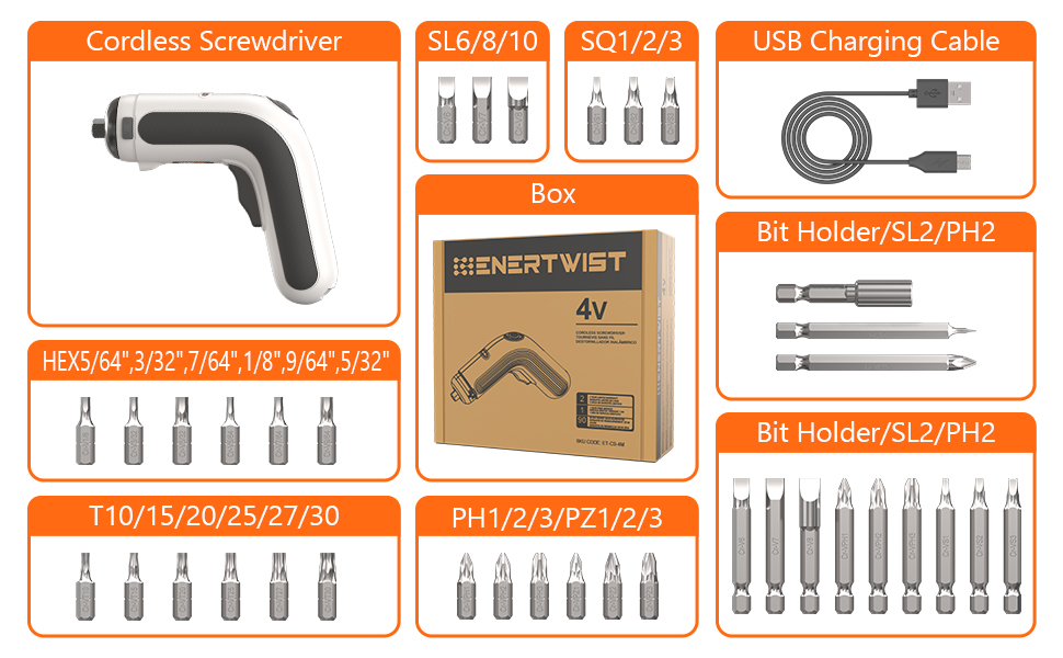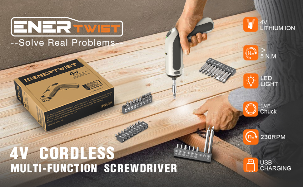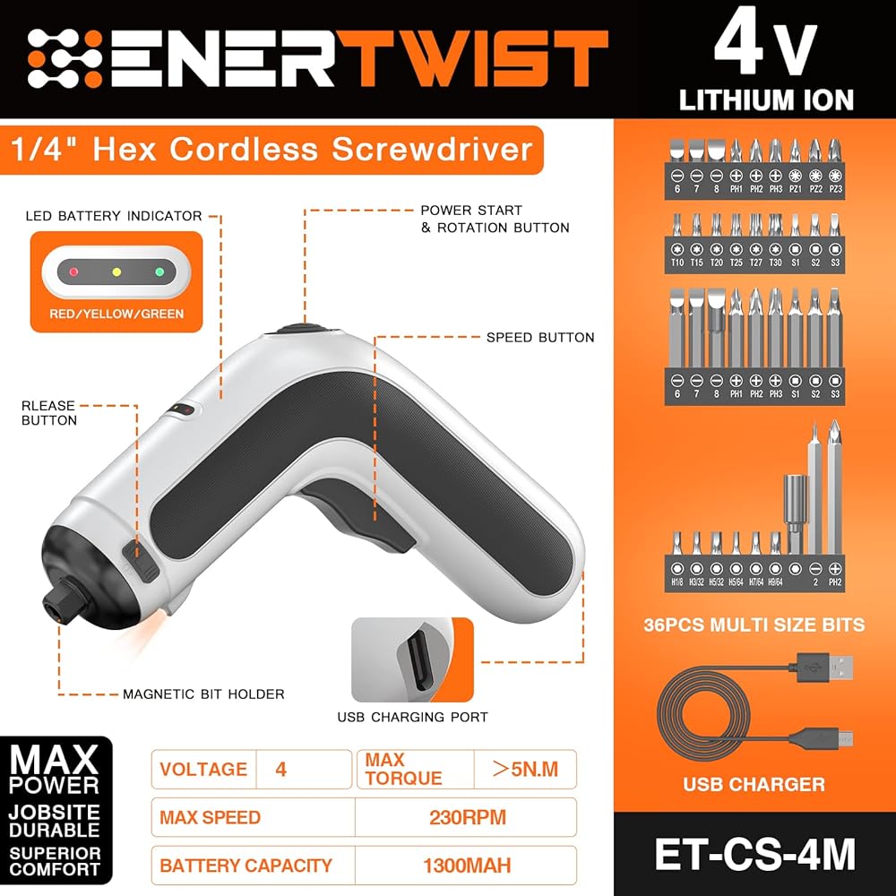 【محرك قوي 4 فولت وقابض سداسية 1/4 بوصة 】مفك براغي لاسلكي EnerTwist مجهز بمحرك 4 فولت عالي الأداء ، 2.5 بوصة سداسية تسمح بتغيير رؤوس مفك البراغي بسرعة وغلق القضبان بإحكام.