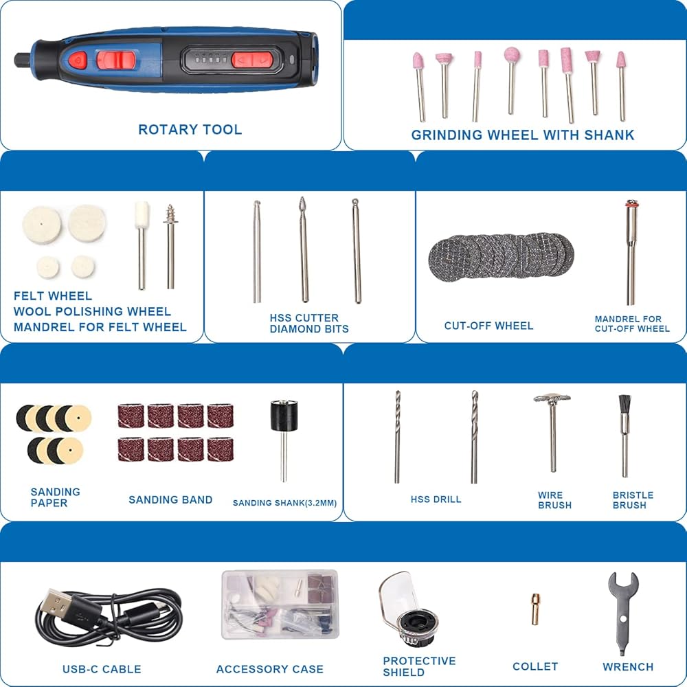 موصل USB للشحن المريح: قابل لإعادة الشحن عبر موصل USB متوافق في أي مكان، أكثر ملاءمة للشحن. وقت الشحن الكامل من 2 إلى 3 ساعات. محتويات المجموعة: تأتي مجموعة الأدوات الدوارة مع: 1 × أداة دوارة هيرزو 4 فولت، 53 ملحق، 1 × كابل USB-C، 1 × درع واقي، 1 × دليل المستخدم.. تذكير لطيف: تم تصميم هذه الأداة الدوارة اللاسلكية للعمل الخفيف فقط.