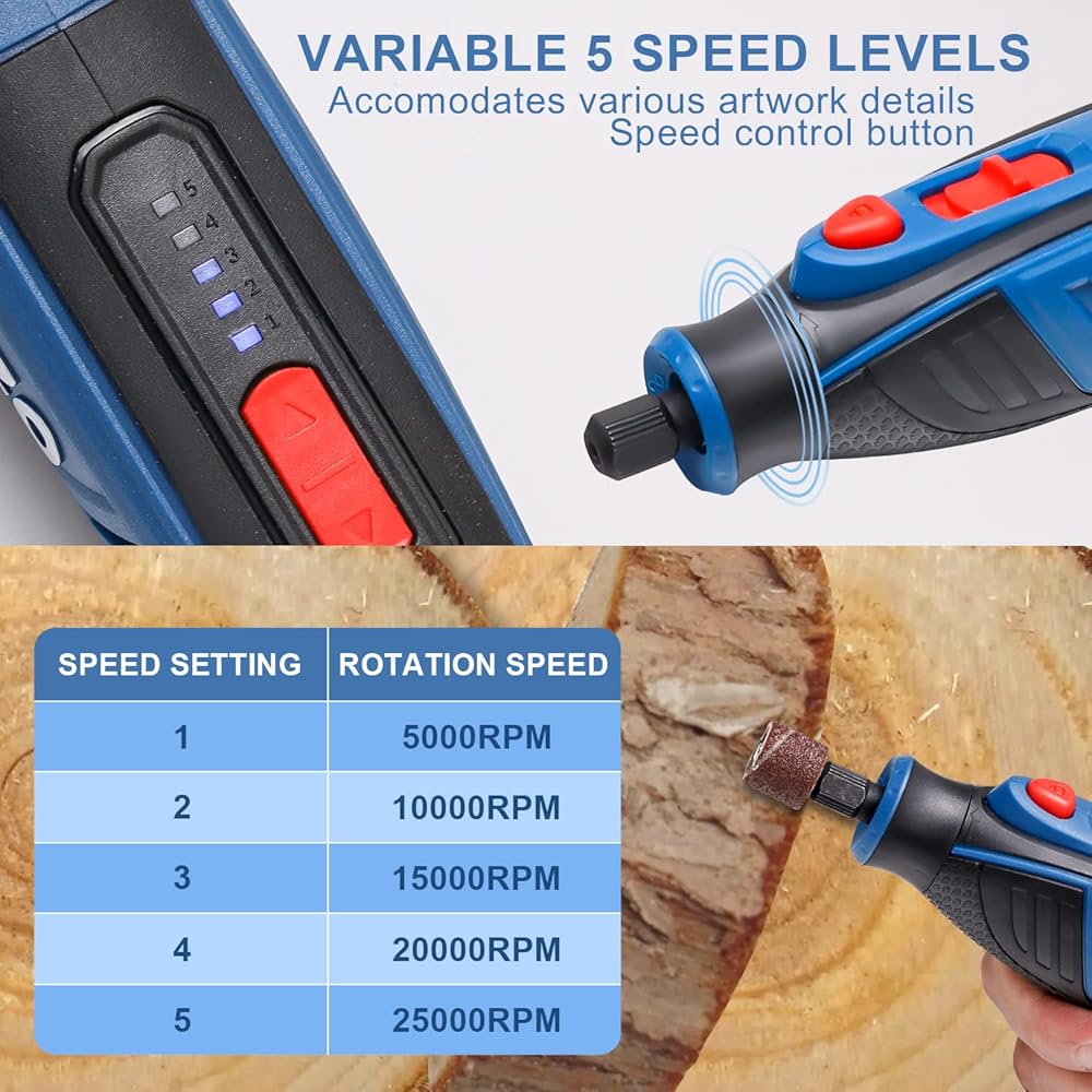 5 سرعات قابلة للتعديل: هذه الأداة مجهزة بنموذج 5 سرعات: 5000، 10000، 15000، 20000، 25000 دورة في الدقيقة، مما يسمح لك بضبط السرعة والتحكم فيها بدقة لتناسب حالات العمل المختلفة، مثل مشاريع التلميع والتنظيف والنقش والنحت.
