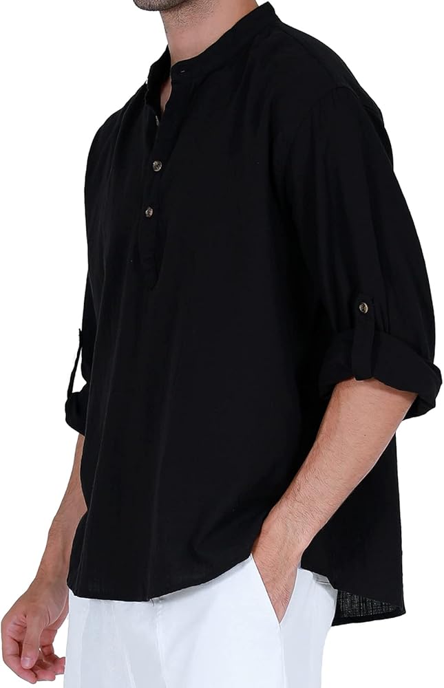 • التصميم: تصميم قميص كتان رجالي بأكمام طويلة، رقبة على شكل حرف V، زر للإغلاق، ياقة واقفة، مقاس نحيف، حاشية مستديرة.
