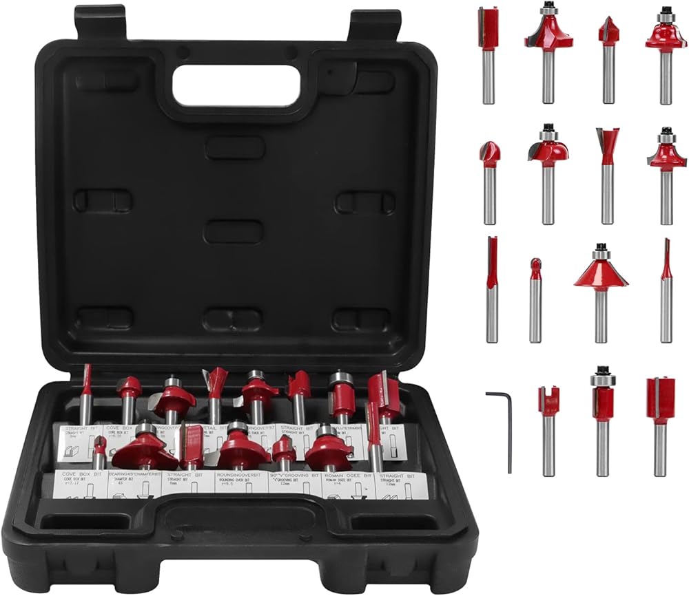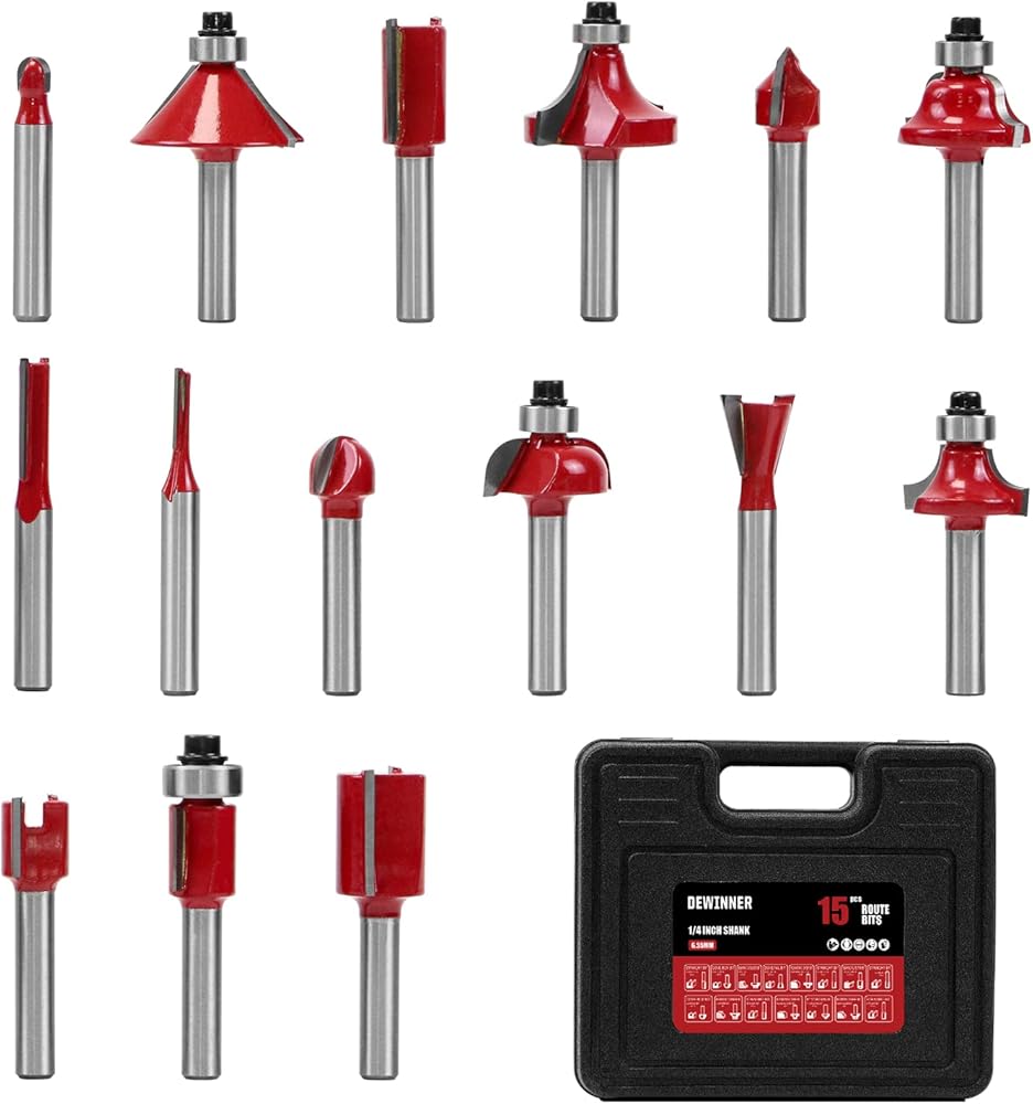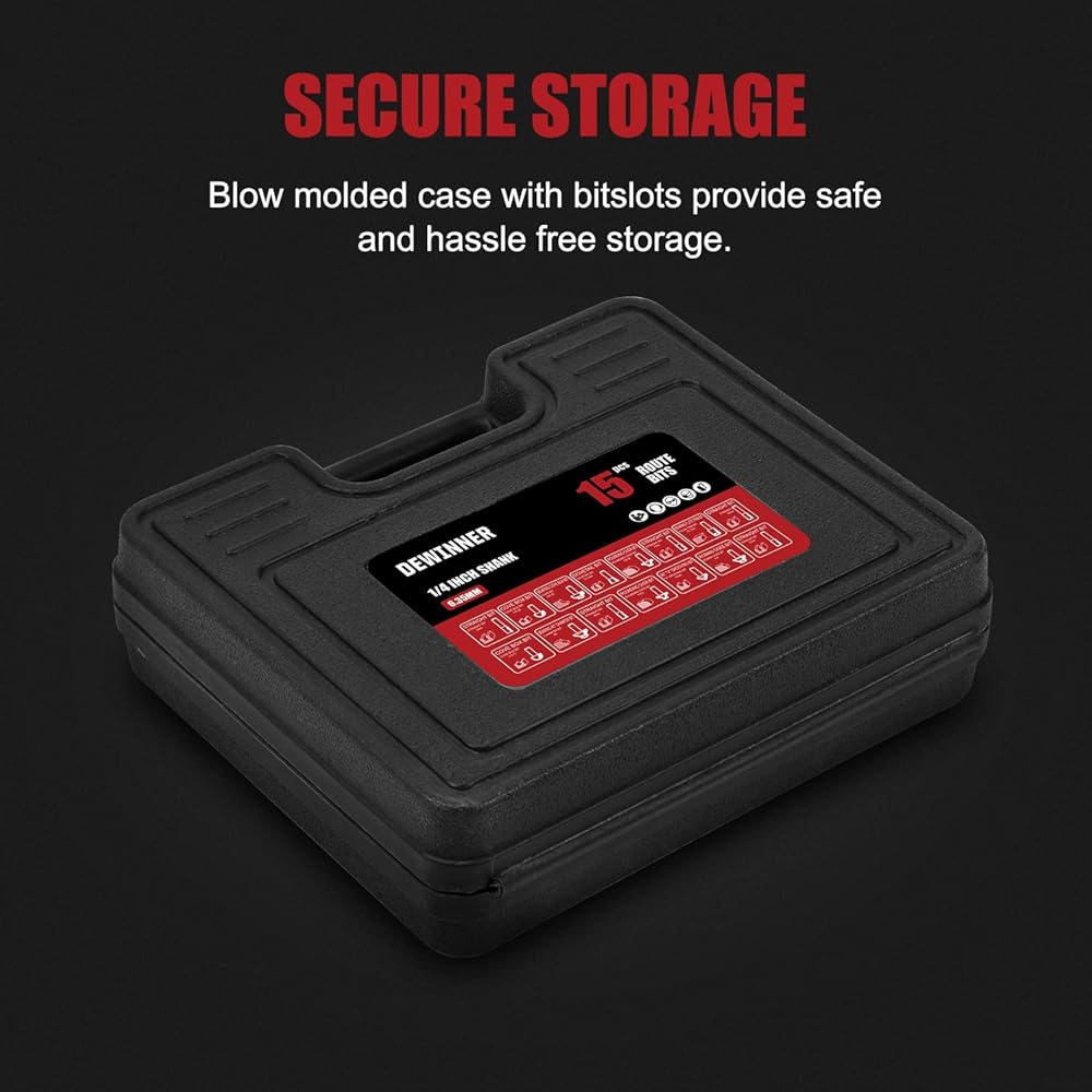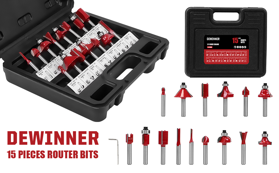دي وينر طقم لقم راوتر 15 قطعة 1/4 انش لاعمال النجارة مع حافظة بلاستيكية بما في ذلك لقم راوتر مشطوفة