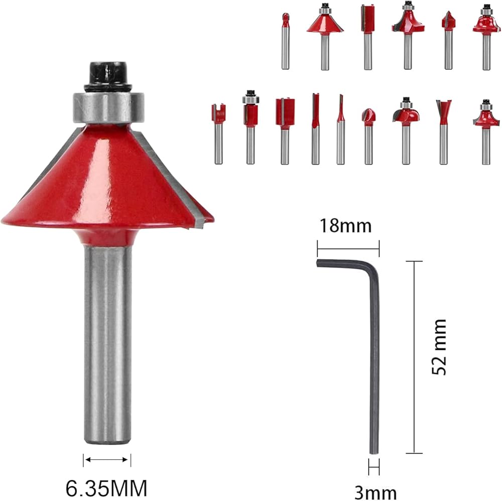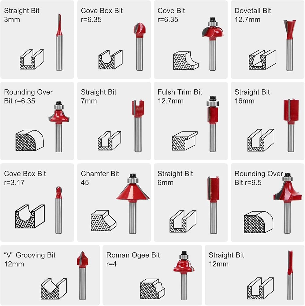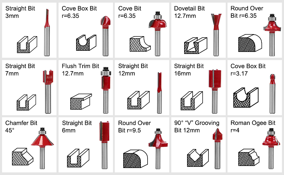 • 【15 لقمة راوتر】5 × رؤوس راوتر مستقيمة، 2 × لقم راوتر دائرية، 2 × لقم راوتر كوف، 1 × لقمة راوتر كوف، 1 × لقمة راوتر متطابقة، 1 × لقمة توجيه مسطحة، 1 × لقمة راوتر مشطوفة، 1 × لقم راوتر تجويف على شكل حرف V 90 درجة، 1 × لقمة راوتر رومان اوجي