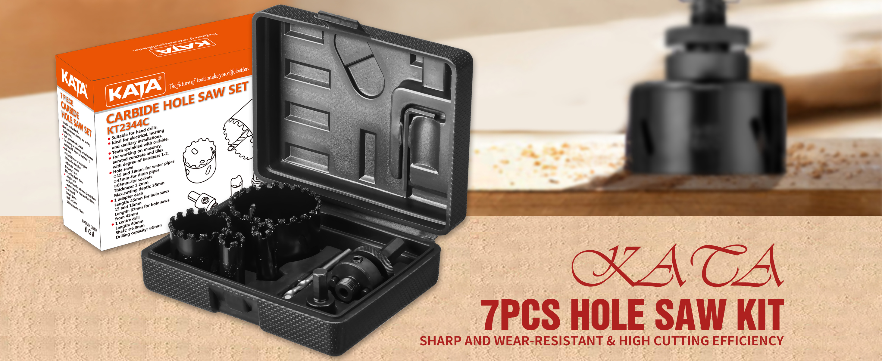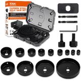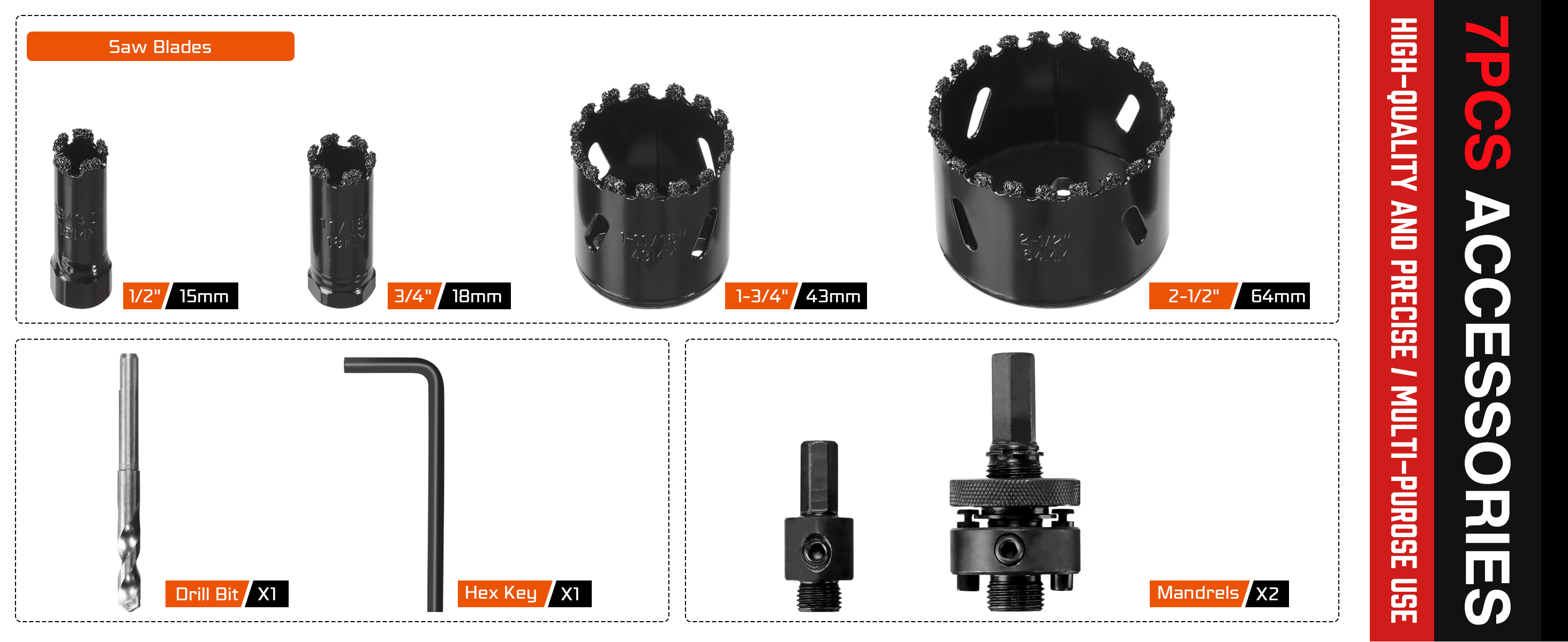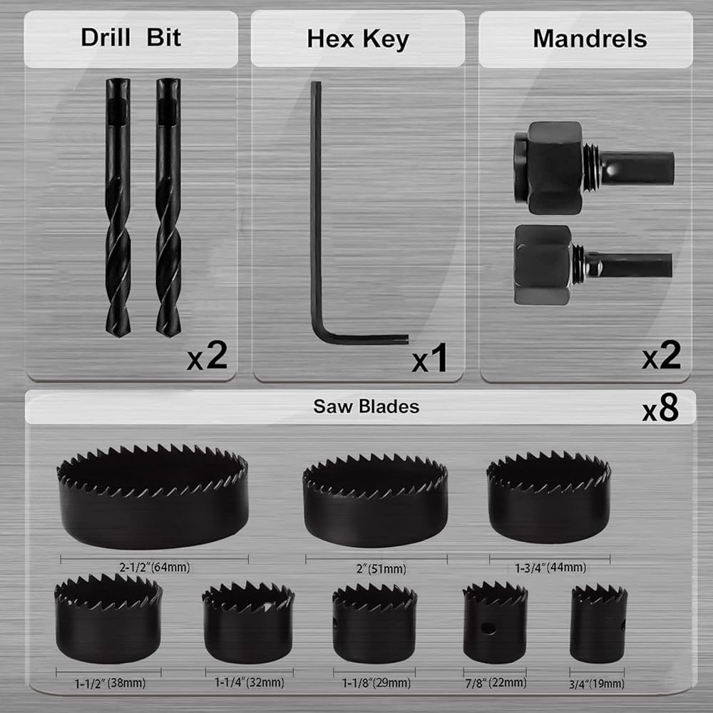 - تتضمن العبوة: 1/2 بوصة (15 مم)، 3/4 بوصة (18 مم)، 1-3/4 بوصة (43 مم)، 2-1/2 بوصة (64 مم) قاطع منشار ثقب، قطعة واحدة من المثقاب المركزي ومحول واحد.