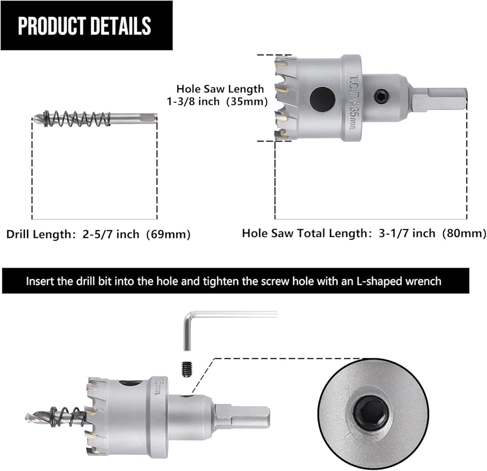 Package includes: 1x Φ 35mm HRC89 TCT carbide hole saw, 1x 2.7in Pilot Drill Bit with Spring Hardness 62, 1x HRC45 hex wrench, packaged in a clear storage box easily stored.