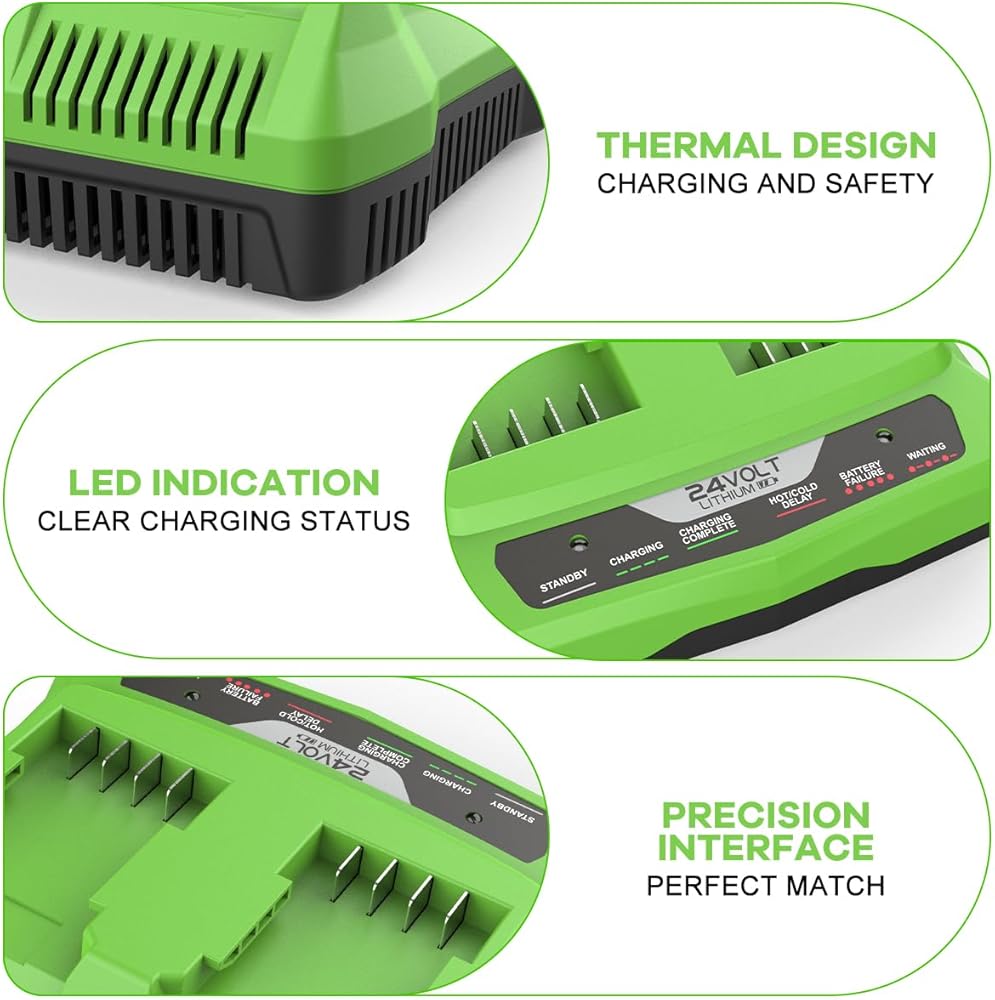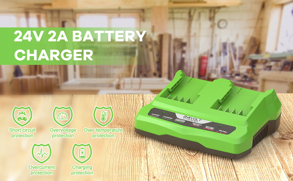 - Charges all Greenworks 24V lithium battery packs (except enhanced series).