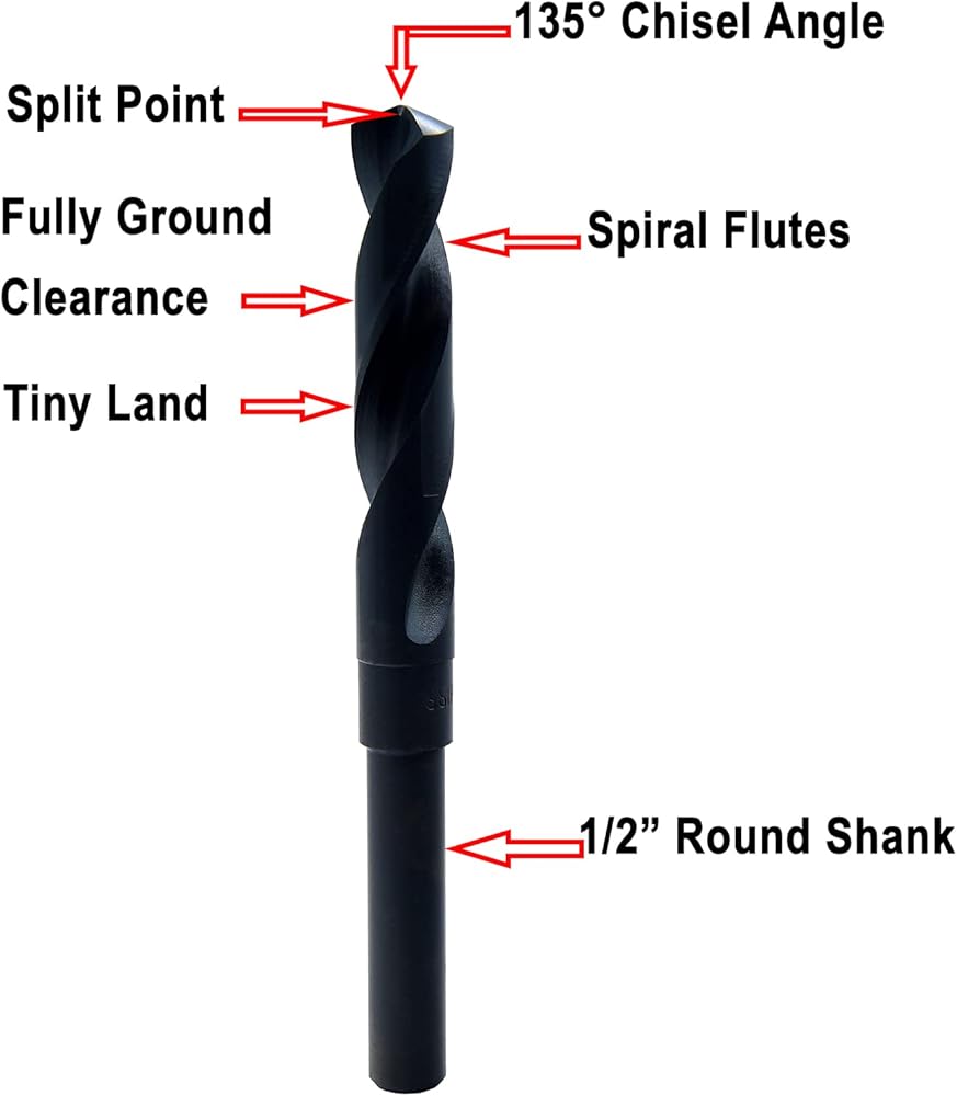 All Silver & Deming Drills are 6" long and feature a 1/2" reduced shank that fits 1/2" drill chuck. Quality high speed steel M2 ensures sharp and fast execution in any material, such as metal, wood, plastic, for clean results. Premium Heat treated is durable and can withstand heavy duty operation for a long tool life. Black Oxide Surface Treatment holds up lubricant better for smoother drilling. Special milled flute design for fast removal of debris. Precision ground with geometry of 118 degree chisel for quick penetration and an accurate start. Custom-Design tools are available too.