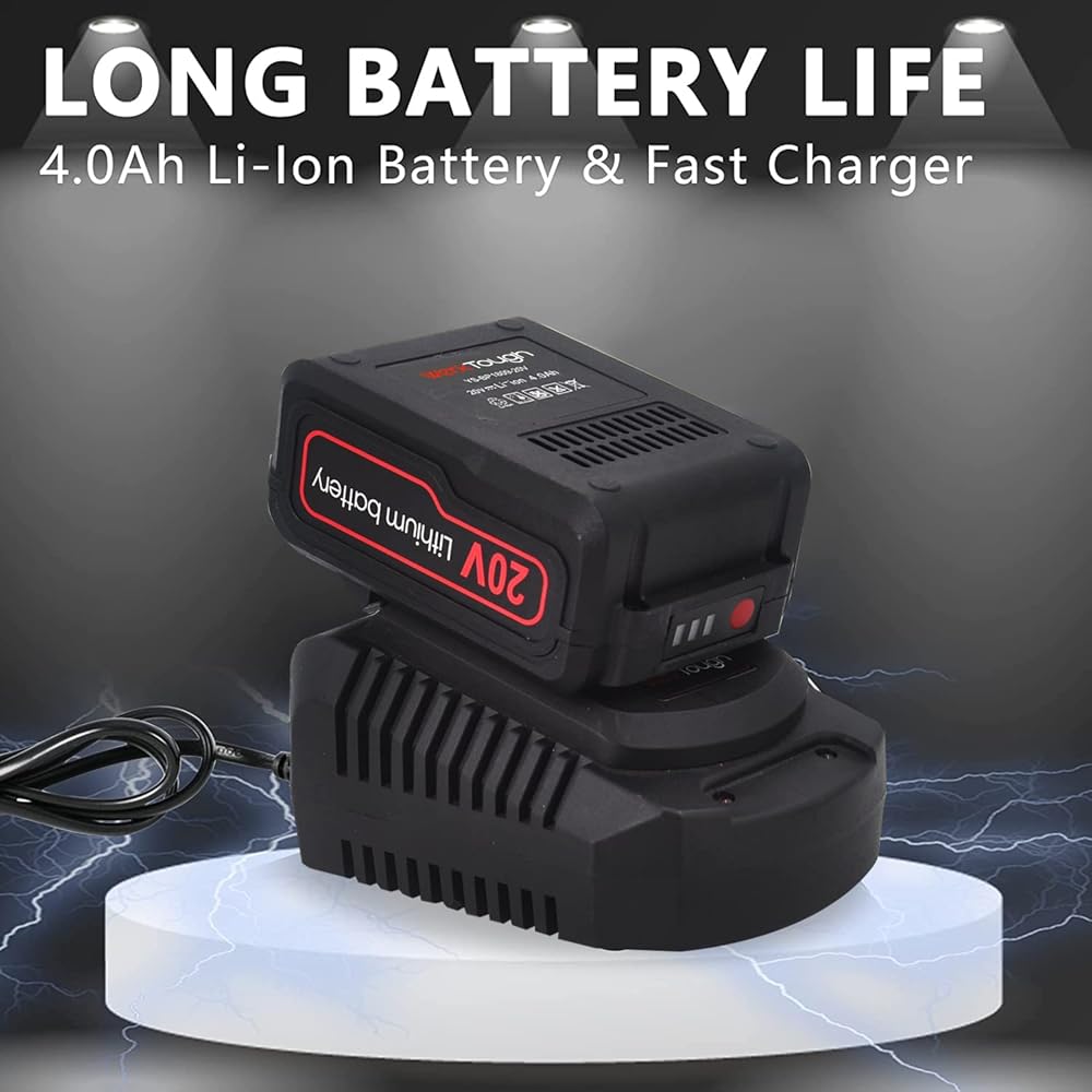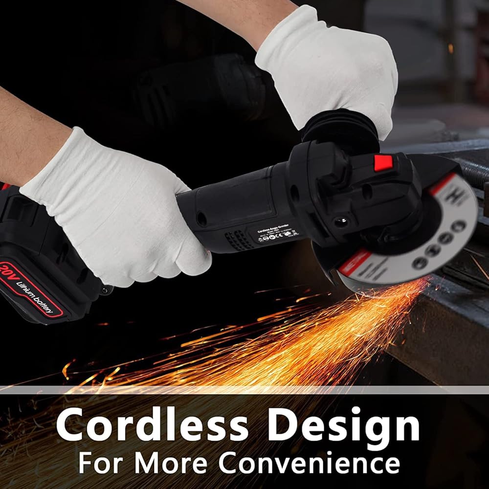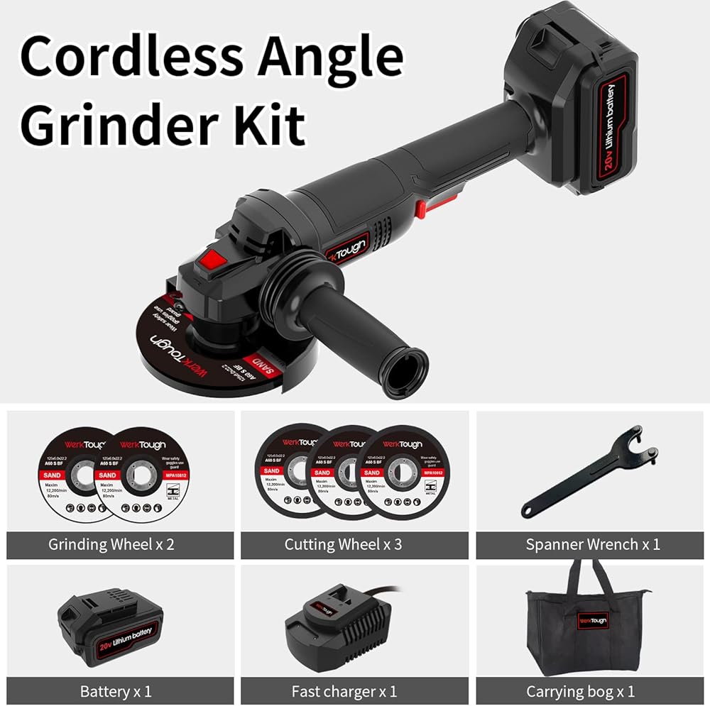 طقم طاحونة زاوية لاسلكية 20 فولت من WERKTOUGH 4-1/2 بوصة مع بطارية ليثيوم أيون 4.0 أمبير وشاحن سريع، سرعة عالية 8000 دورة في الدقيقة، مقبض سهل مع 3 قطع قرص قطع وقرص طحن 2 قطعة في حقيبة الأدوات